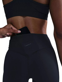 - High-rise wide, flat waistband - 5" inseam length - Designed to help reduce rolling, pinching, and sliding - Midweight fabric - Tight fit - Nike swoosh logo on center back - Silky smooth finish - Rear envelope pocket can fit most phones - Two (2x) side leg pockets - Body: 77% polyester, 23% spandex - Panel lining: 77% polyester, 23% spandex - Nike Dri-FIT technology sweat-wicking - InfinaSmooth squat-proof fabric