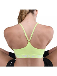 - Dial in your perfect fit with thin straps that easily adjust in the back. - Every day and every workout has different needs, and that's why we've updated the Indy bra to give you choices. - Nike Dri-FIT technology moves sweat away from your skin for quicker evaporation, helping you stay dry and comfortable. - Soft jacquard chest band sits snugly against your skin without pinching or binding. - Body: 78-79% polyester/21-22% spandex. Bottom hem: 53% polyester/28% nylon/19% spandex. Straps: 52% polyester/32% spandex/16% nylon. Lining: 84% polyester/16% spandex. Interlining: 80% polyester/20% spandex. Pad top fabric/Pad back fabric: 100% polyester. Pad: 100% polyurethane. - Machine wash - Imported