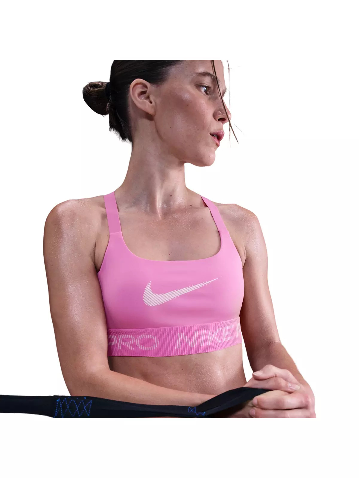 - Nike Dri-FIT technology moves sweat away from your skin for quicker evaporation, helping you stay dry and comfortable. - A soft jacquard elastic chest band sits snugly against your skin without pinching or binding. - Printed Swoosh logos on front and back - Body/lining: 83% polyester/17% spandex. Bottom hem: 90% polyester/10% spandex. Straps: 73% nylon/27% spandex. - Machine wash - Imported