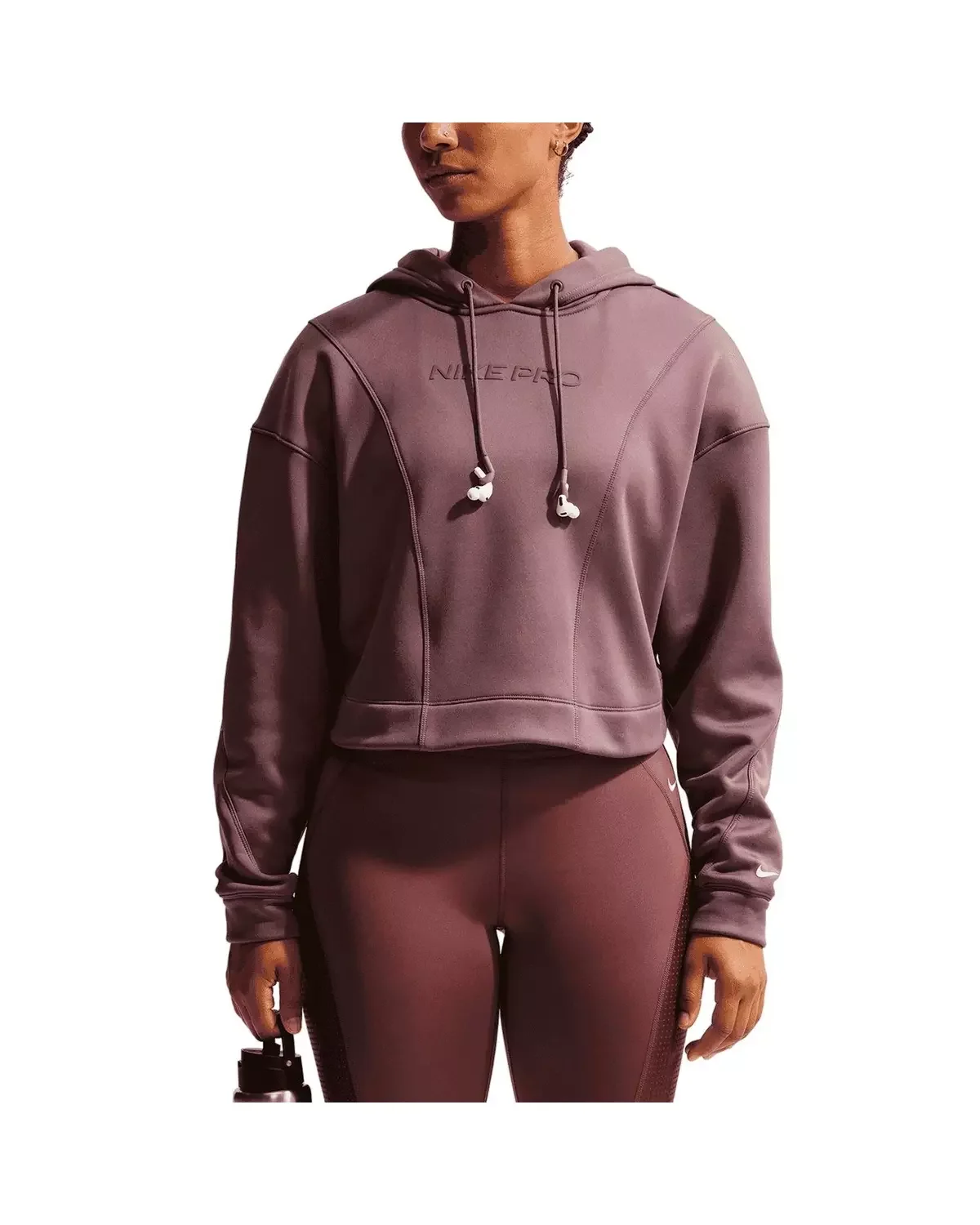 - Unapologetic, confident style goes with anything. From leggings to tops to more, Nike Pro rounds out your wardrobe with pieces that help you stand out. - Nike Therma-FIT technology helps manage your body’s natural heat to help keep you warm in cold-weather conditions. - Lightweight, stretchy fabric gives you the best of both worlds: It looks sleek and feels cozy, thanks to supersmooth fabric on the outside and unbelievably soft brushed fleece on the inside. - Specially designed drawcord with silicone holders can store certain earbuds. - Swoosh logo on sleeve - Nike Pro branding at chest - Body: 91% polyester/9% spandex. Hood Lining: 75% polyester/13% cotton/12% rayon. - Machine wash - Imported