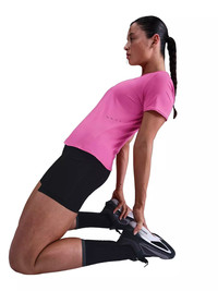 - Modified raglan sleeves with the optimal length are designed to help reduce underarm chafing and allow for a wider range of motion. - Nike Dri-FIT technology moves sweat away from your skin for quicker evaporation, helping you stay dry and comfortable. It combines with a large mesh panel on the back that helps moisture escape. - The top is tapered around the waist so that layering with other pieces is easier. Plus, a curved hem helps keep you covered through your stride. - Reflective Swoosh logo on left chest - Reflective graphics on sides and back - Not intended for use as Personal Protective Equipment (PPE) - Body: 88% polyester/12% spandex. Mesh: 100% polyester. - Machine wash - Imported