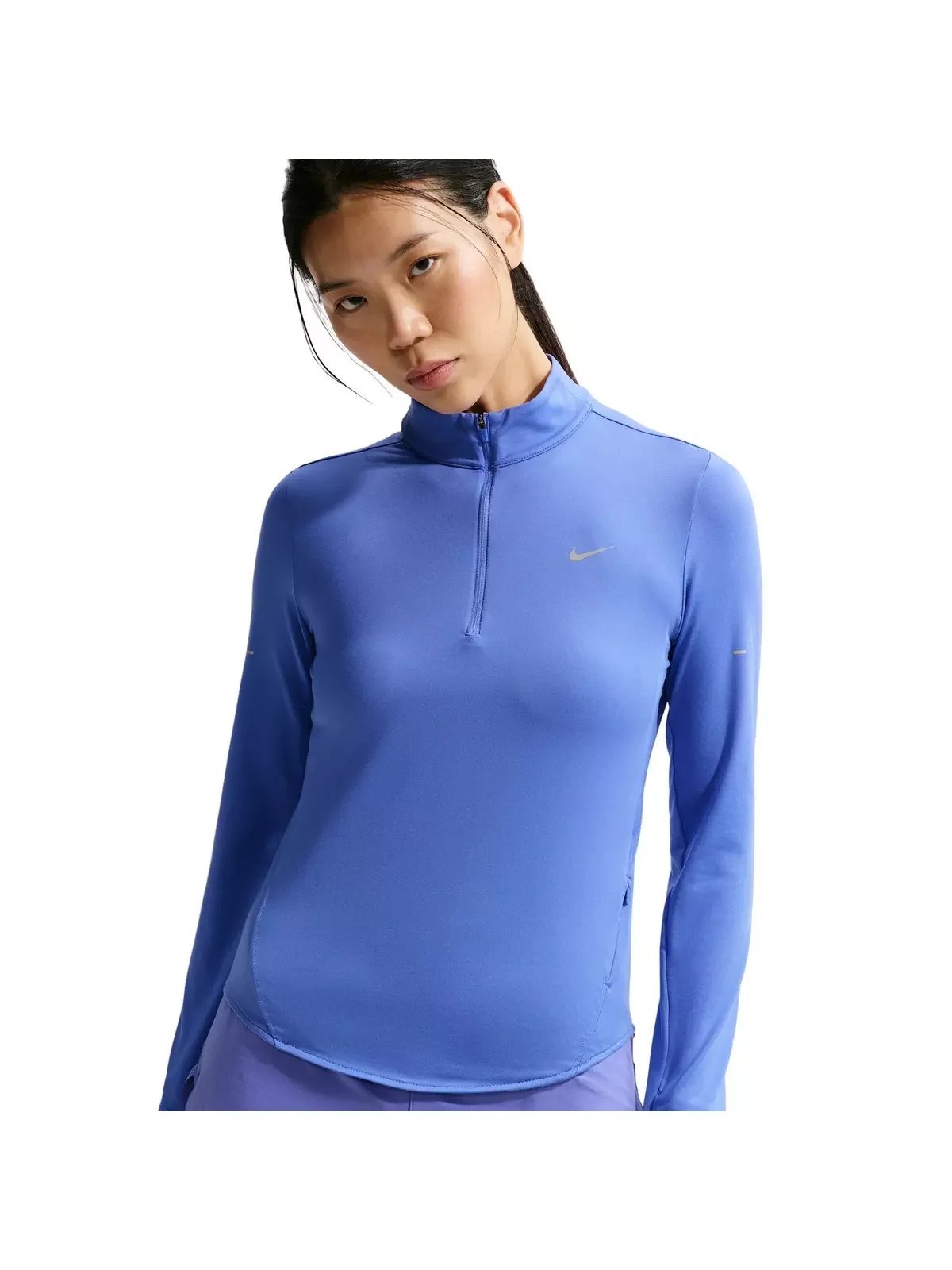 - Modified raglan sleeves are designed to help reduce underarm chafing and allow for a wider range of motion. - Nike Dri-FIT technology moves sweat away from your skin for quicker evaporation, helping you stay dry and comfortable. - The top is tapered around the waist so that layering with other pieces is easier. A curved hem helps keep you covered through your stride. Plus, thumbholes let you extend your coverage and help hold the sleeves in place. - Watch windows on either sleeve make it easy to check time. A zip pocket on the left side seam fits items like earbuds, a key or a card. - Reflective Swoosh logo on left chest - Reflective graphics on sleeves and back - Not intended for use as Personal Protective Equipment (PPE) - 1/4-length zipper with zipper guard - This product provides UVA and UVB protection from the sun only in the areas covered by the garment. To protect exposed areas, the use of good quality sunscreen is recommended. - Body: 88% polyester/12% spandex - Machine wash - Imported