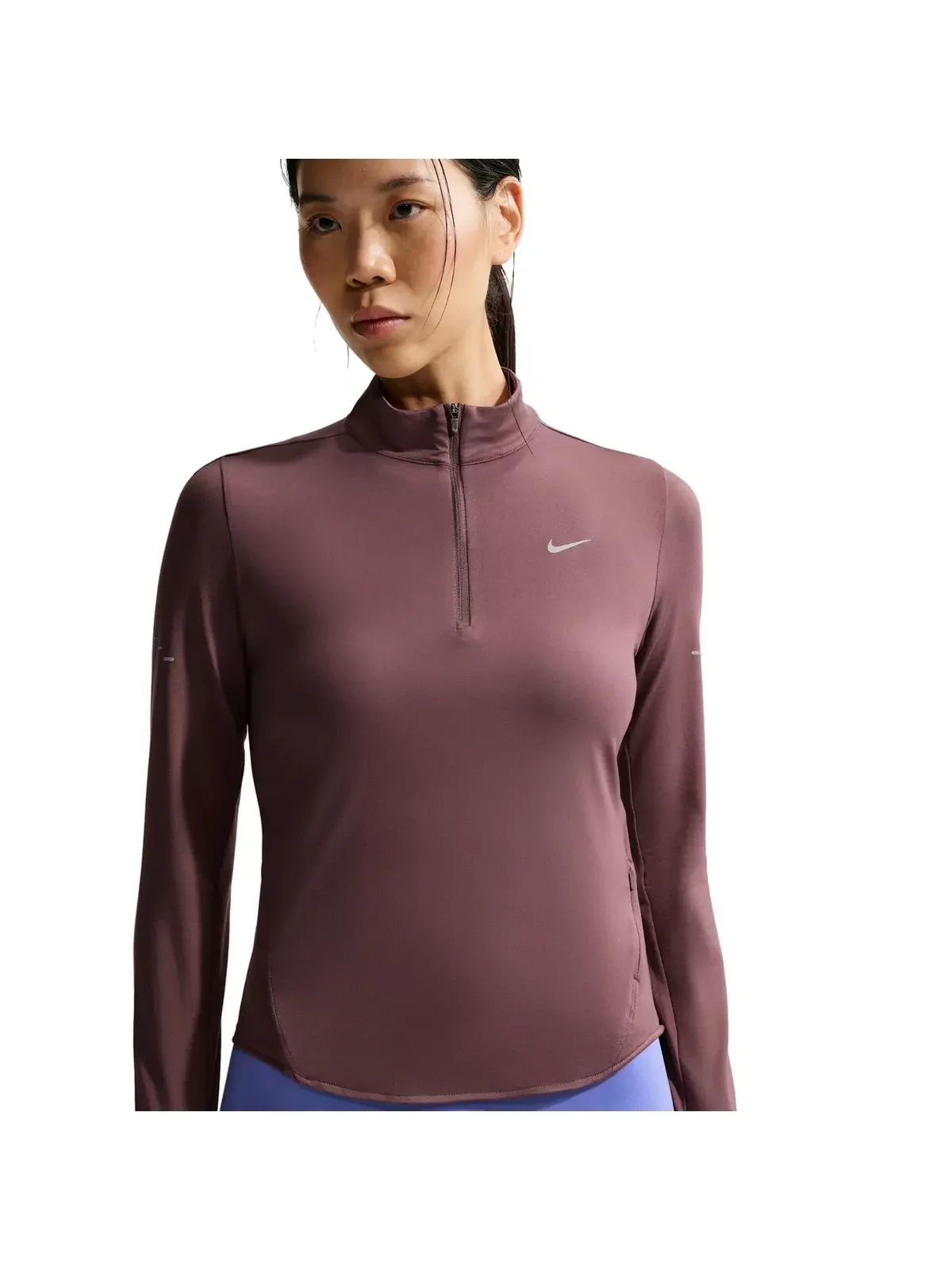 - Modified raglan sleeves are designed to help reduce underarm chafing and allow for a wider range of motion. - Nike Dri-FIT technology moves sweat away from your skin for quicker evaporation, helping you stay dry and comfortable. - The top is tapered around the waist so that layering with other pieces is easier. A curved hem helps keep you covered through your stride. Plus, thumbholes let you extend your coverage and help hold the sleeves in place. - Watch windows on either sleeve make it easy to check time. A zip pocket on the left side seam fits items like earbuds, a key or a card. - Reflective Swoosh logo on left chest - Reflective graphics on sleeves and back - Not intended for use as Personal Protective Equipment (PPE) - 1/4-length zipper with zipper guard - This product provides UVA and UVB protection from the sun only in the areas covered by the garment. To protect exposed areas, the use of good quality sunscreen is recommended. - Body: 88% polyester/12% spandex - Machine wash - Imported