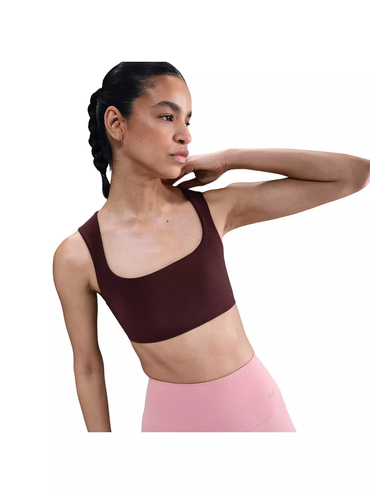 - Nike Dri-FIT technology moves sweat away from your skin for quicker evaporation, helping you stay dry and comfortable. - Light support gives you a gentle hold with plenty of freedom that's great for low-impact workouts or all-day comfort. - Swoosh logo at back - Body: 63% nylon/37% spandex. Lining: 88% polyester/12% spandex. - Machine Wash - Imported