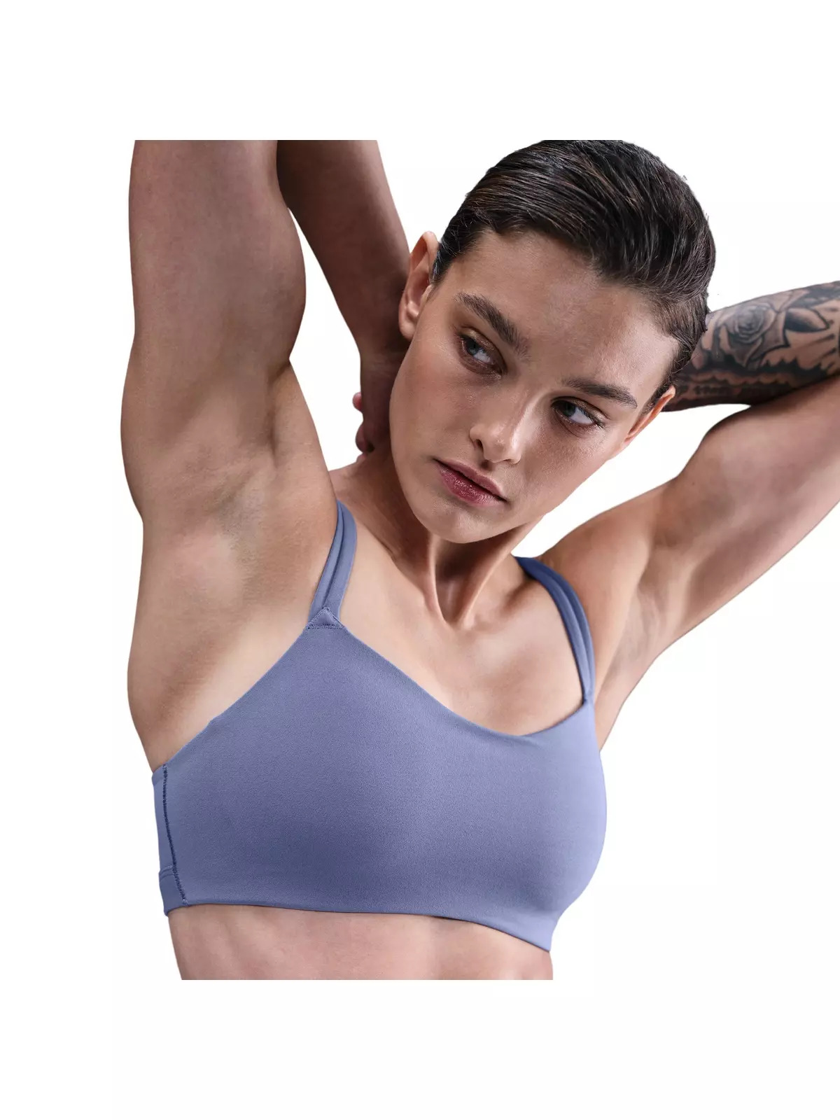 - Light support gives you a gentle hold with plenty of freedom that's great for low-impact workouts or all-day comfort. - Nike Dri-FIT technology moves sweat away from your skin for quicker evaporation, helping you stay dry and comfortable. - Body: 63% nylon/37% spandex. Front and back liner: 82% polyester/18% spandex. Pad: 100% polyurethane. Pad back fabric: 100% polyester. - Machine wash - Imported