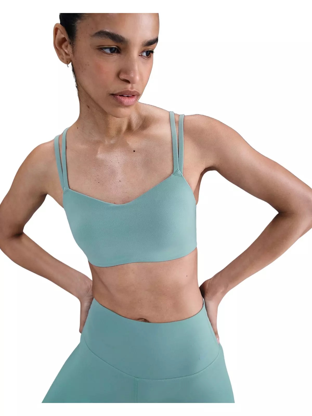 - Light support gives you a gentle hold with plenty of freedom that's great for low-impact workouts or all-day comfort. - Nike Dri-FIT technology moves sweat away from your skin for quicker evaporation, helping you stay dry and comfortable. - Body: 63% nylon/37% spandex. Front and back liner: 82% polyester/18% spandex. Pad: 100% polyurethane. Pad back fabric: 100% polyester. - Machine wash - Imported