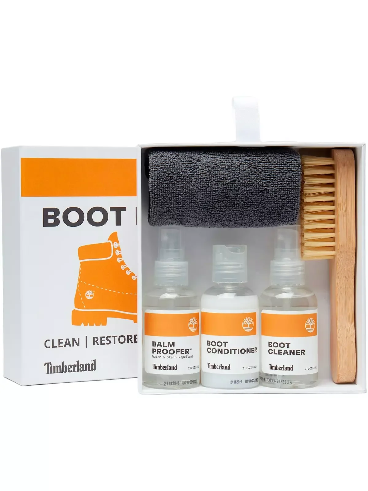 - Contains a handled brush, towel and three key products to care for your boots: Boot Cleaner, Boot Conditioner and Balm Proofer Water & Stain Repellent - Cleans, conditions and protects boots - 2fl oz (59ml bottles) - Reusable kit box - Imported