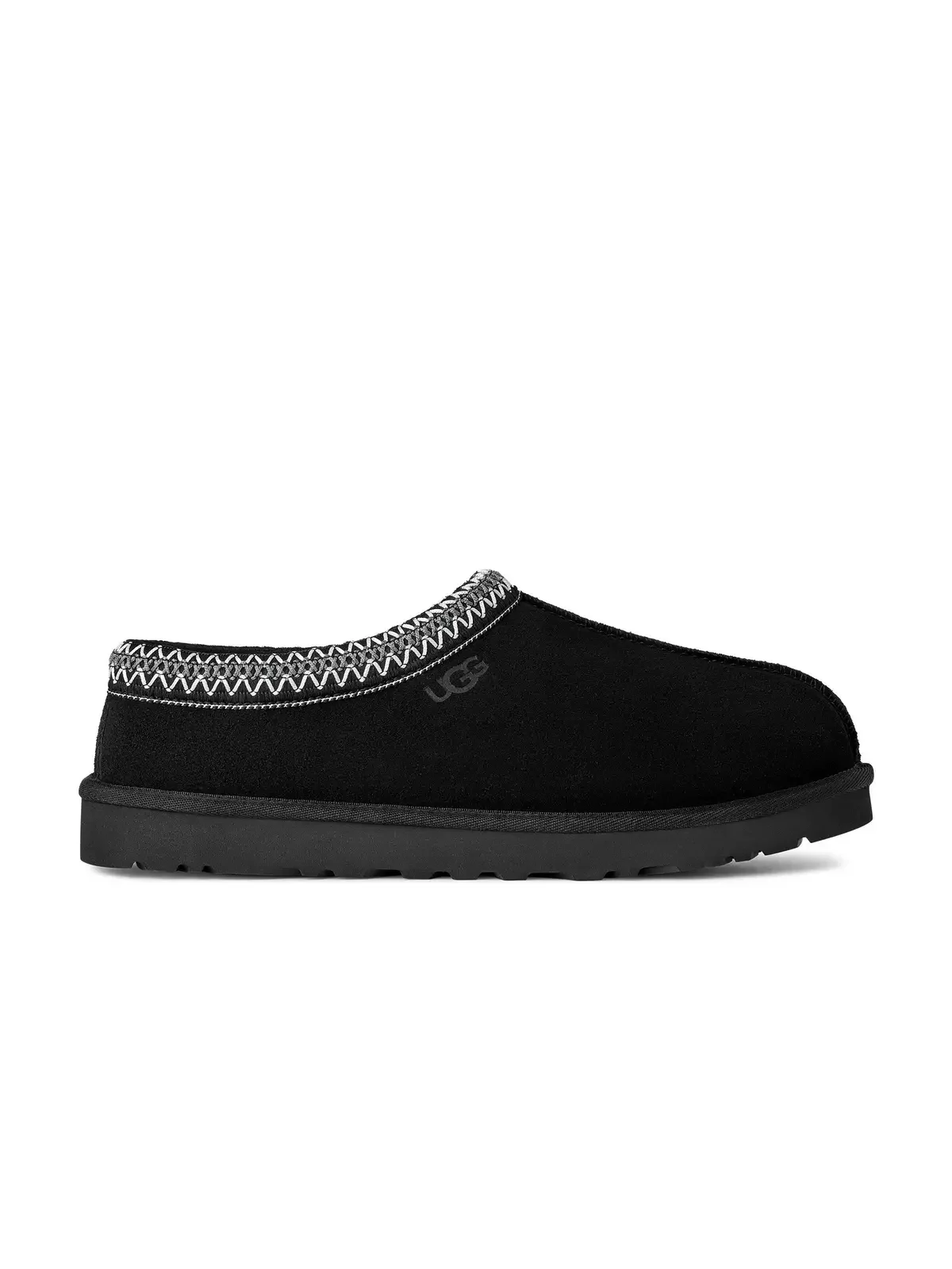 - Premium suede upper offers a sleek look alongside lasting support in the UGG Tasman II. - Eco-friendly braided detailing reduces waste and enhances fit on this Black Men's Slipper. - Plush lining delivers exceptional warmth and softness. - Cushions every step with natural wool comfort. - Lightweight foam footbed promotes all-day cushioning. - Sustainable outsole offers reliable traction on various surfaces. - Durable binding boosts longevity and reduces environmental impact. - Iconic branding adds a refined finishing touch.