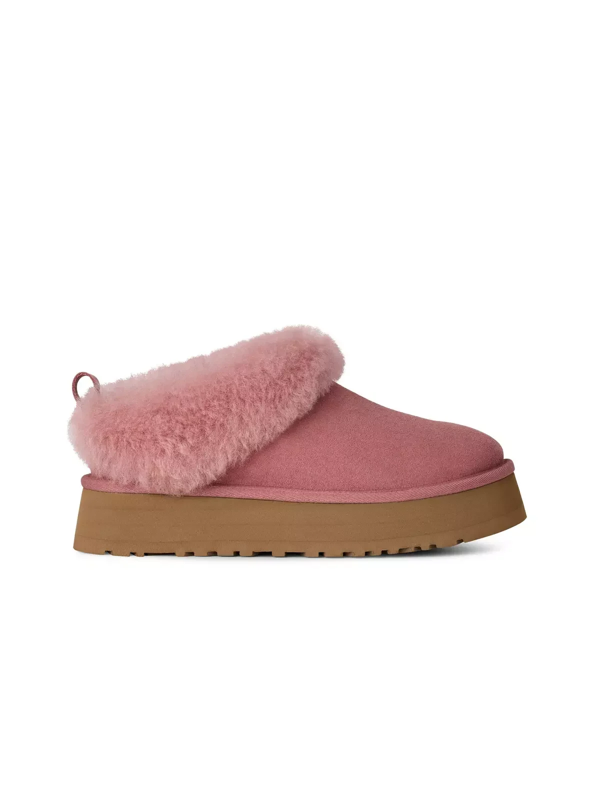 - 10mm sheepskin insole - EVA midsole - Sugarcane EVA outsole - Textile binding made from 100% recycled polyester fibers - 1.75" platform height - The UGGA® Logo, embossed suede heel label - RN 88276 - This product contains real fur from sheep or lamb. Fur may be sourced from Australia, Ireland, the United Kingdom, or the United States. It has been artificially dyed and treated.