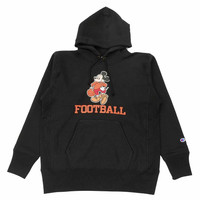 - This is a hoodie from the "REVERSE WEAVE 11.5oz Terry Fleece" series. Hoodies for this series are made of fabric with brushed lining, using the "REVERSE WEAVE" manufacturing method, which is synonymous with "THE KING OF SWEATSHIRTS" of "Champion". "Reverse Weave" is that the fabric originally used in the vertical direction is used in the horizontal direction to prevent vertical fabric shrinkage, and at the same time, "EXPANSION GUSSET" on both underarms is adopted to reduce the influence of horizontal shrinkage and to allow for ease of movement. It has an authentic silhouette, and the name tag uses the commonly known "blue single-color tag" which was used in 1970s products. It has a Mickey Mouse design with a football motif on the front. - Main: 90% Cotton / 10% Polyester - Rib: 100% Cotton - Reverse Weave Hoodie - Brushed Lining - Flat-seamer sewing on the sides - Made in Cambodia - Model Wearing Size: M (Height 170cm / Weight 52kg)