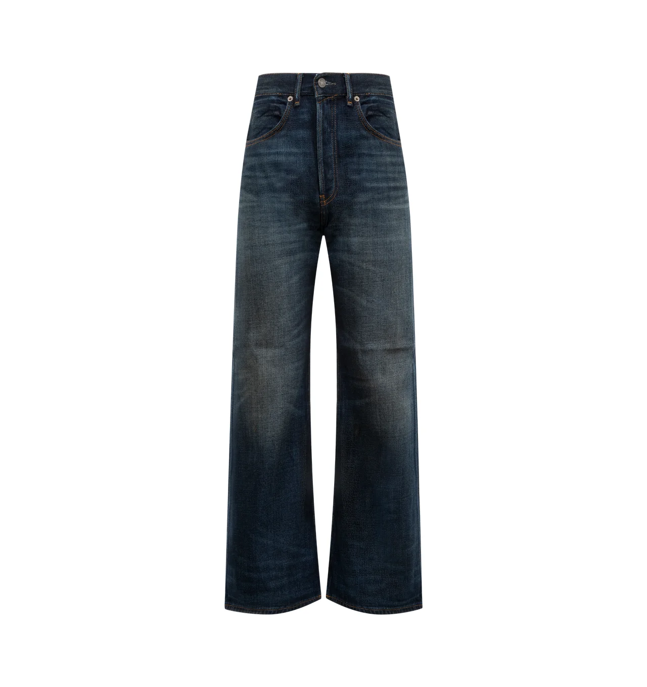 ACNE STUDIOS 2021f Yoyogi Wide Leg Jean featuring button fly closure, 5-pocket styling, intentional whiskering and fading, leather logo patch at back and rigid denim fabric. 100% cotton. Made in Italy. DESIGNER STYLE ID: A00556 COLOR: 838 DARK BLUE