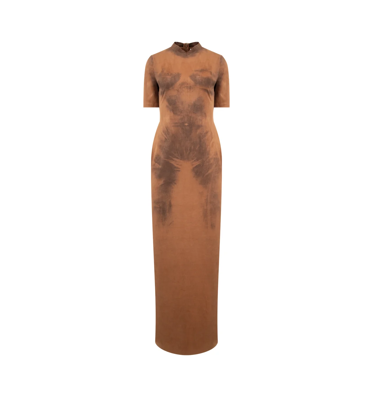 ACNE STUDIOS Trompe-l’œil Suede Dress featuring fitted silhouette, long length, Trompe-l’œil body print, faux suede, short sleeves, v-neckline, back slit and invisible zip closure. 10% elastane, 90% polyester. DESIGNER STYLE ID: A20910 COLOR: 295 COGNAC BROWN