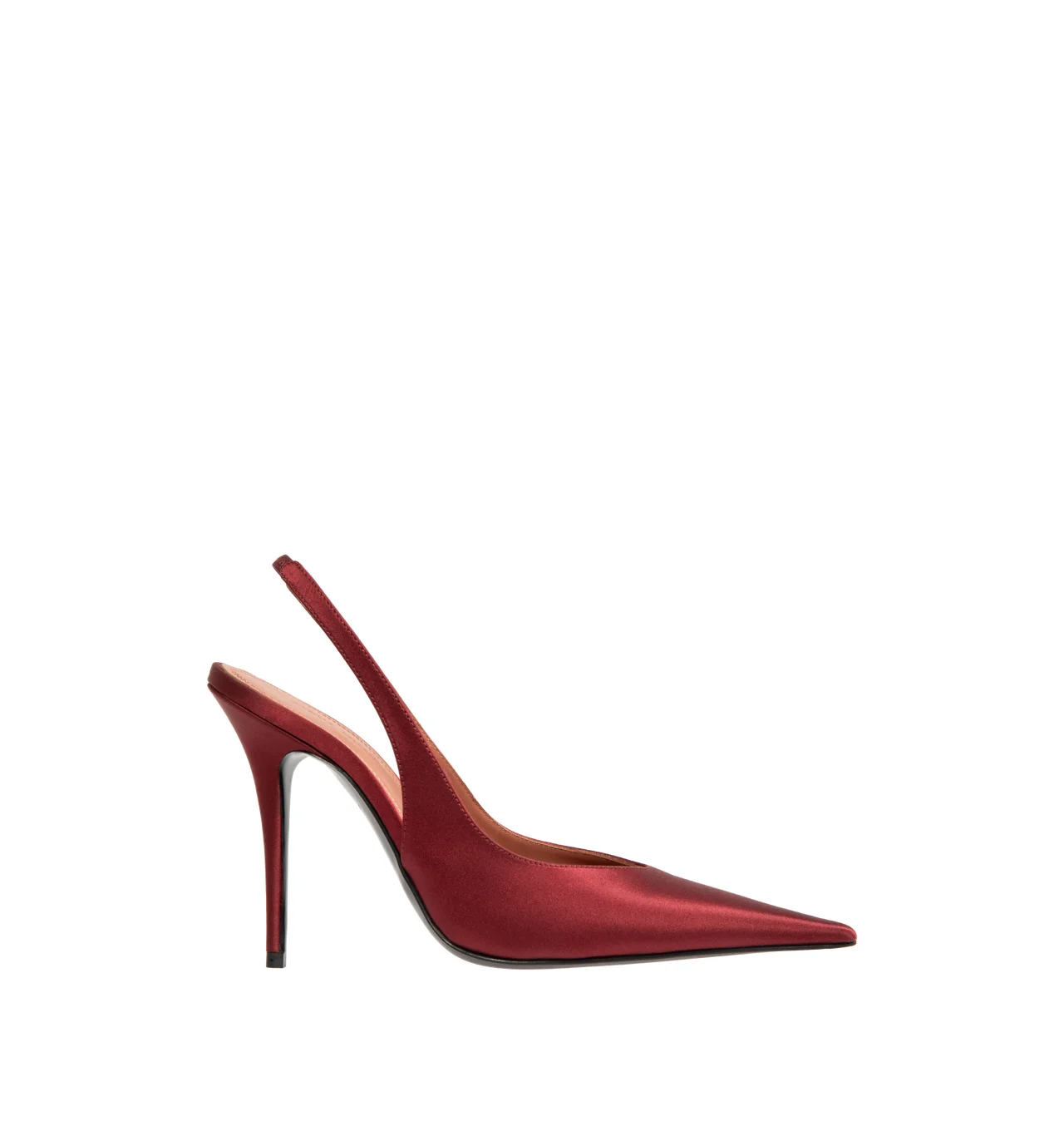 AMINA MUADDI Anok Satin Slingback Pumps featuring elasticated slingback strap, pointed toe and 105mm heels. Upper: silk. Lining: leather. Sole: leather insole, leather and rubber sole. Made in Italy. DESIGNER STYLE ID: 15S365618AN0 COLOR: SATIN WINE