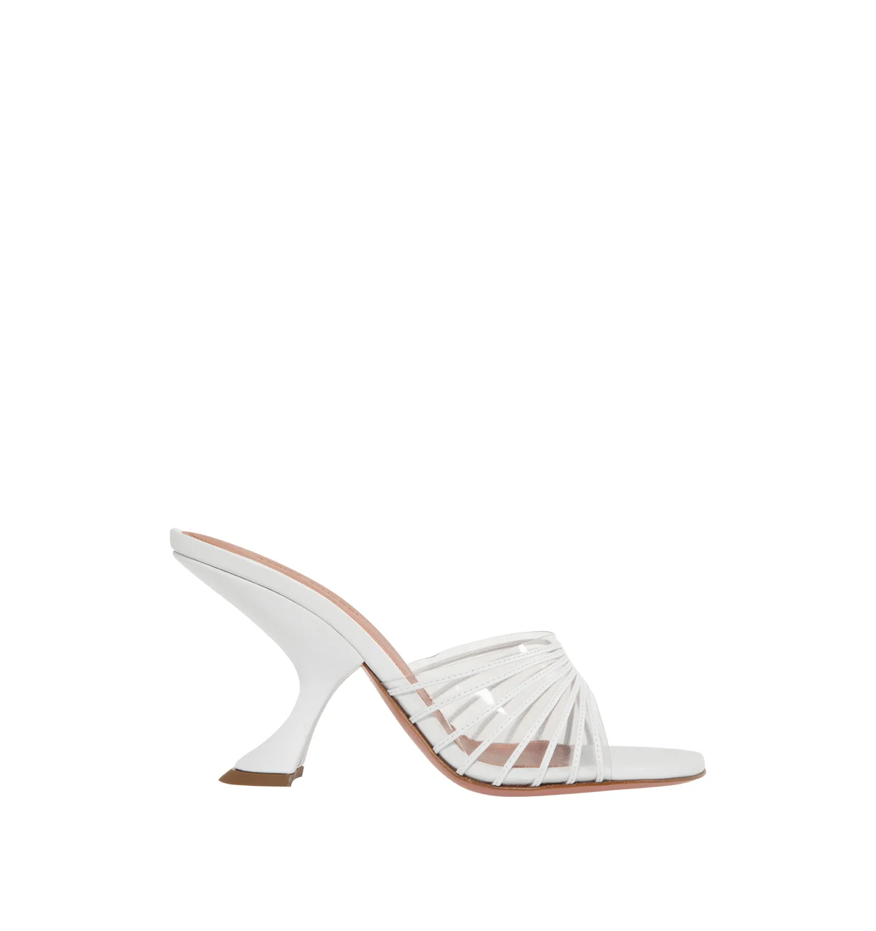 AMINA MUADDI Mookie Slipper featuring rounded open toe, caged upper and 90mm slanted heel. 50% lambskin and 50% PVC. Made in Italy. DESIGNER STYLE ID: M00KIESLIPPER90 COLOR: WHITE/PVC