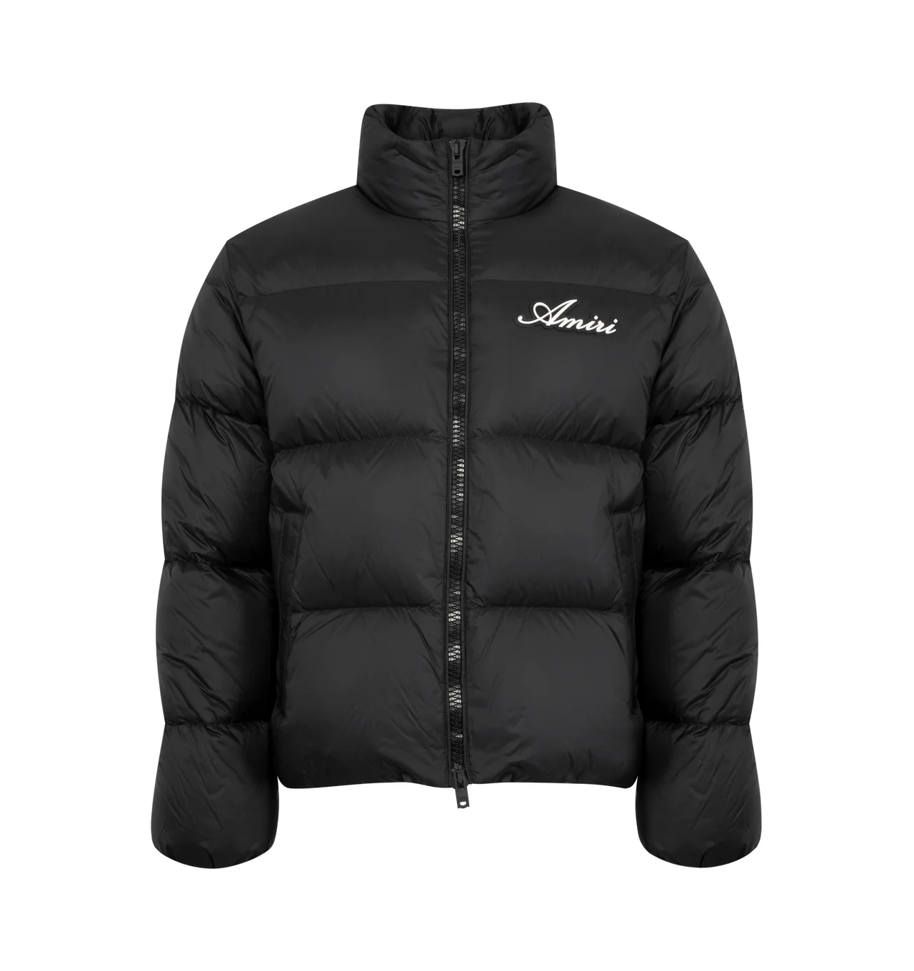 AMIRI Bones Down Puffer Jacket featuring a logo at the chest, signature bone graphics on each sleeve, stand collar, drop shoulders, long sleeves, elasticized cuffs, waist zip pockets and two-way front zip closure. 100% nylon. DESIGNER STYLE ID: AM0UDW1008 COLOR: 001 BLACK