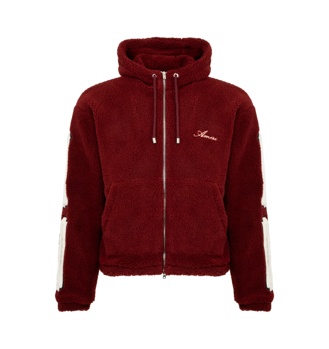 AMIRI Bones Cotton Fleece Zip-Up Hoodie featuring plush cotton fleece, signature contrast bones patchwork along each sleeve, attached drawstring hood, drop shoulders, long sleeves, split kangaroo pocket and two-way front zip closure. 100% cotton. Made in Italy. DESIGNER STYLE ID: AM0UJA1010 COLOR: 644 DEEP RED
