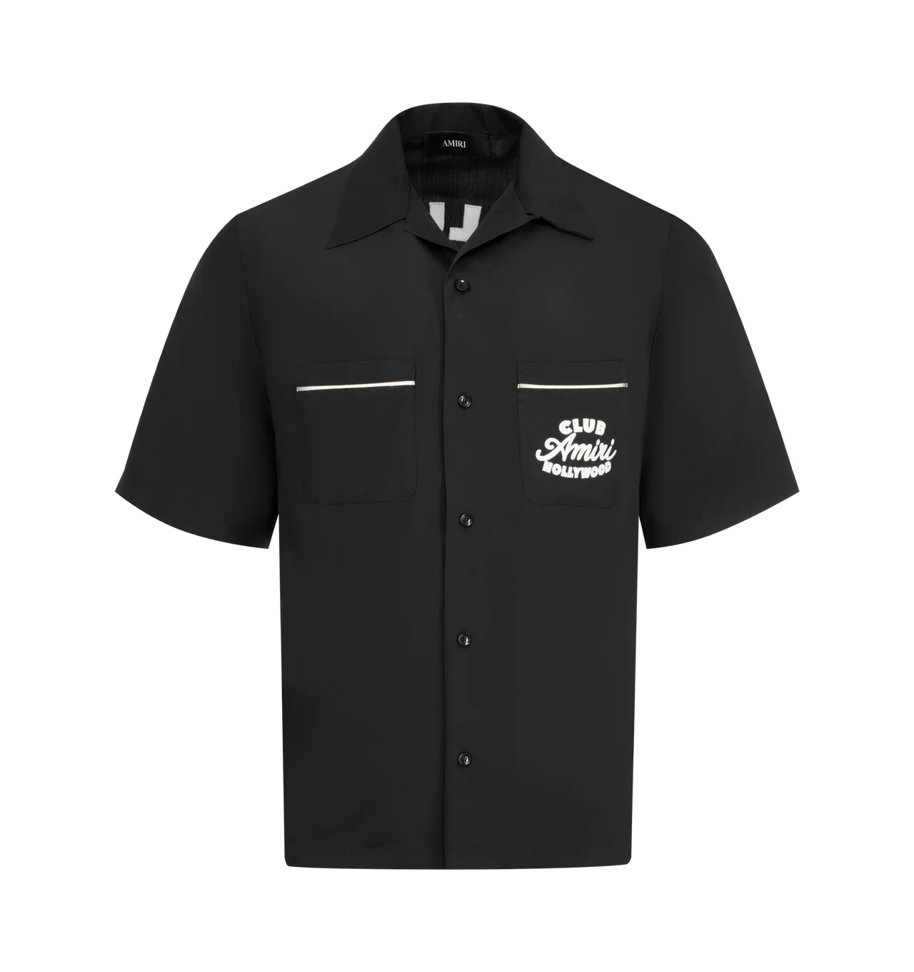 AMIRI Club Amiri Camp Shirt featuring open spread collar, button closure, logo at chest and back, patch pocket and short sleeves. Made in Italy. DESIGNER STYLE ID: AMSTCA1194 COLOR: BLACK