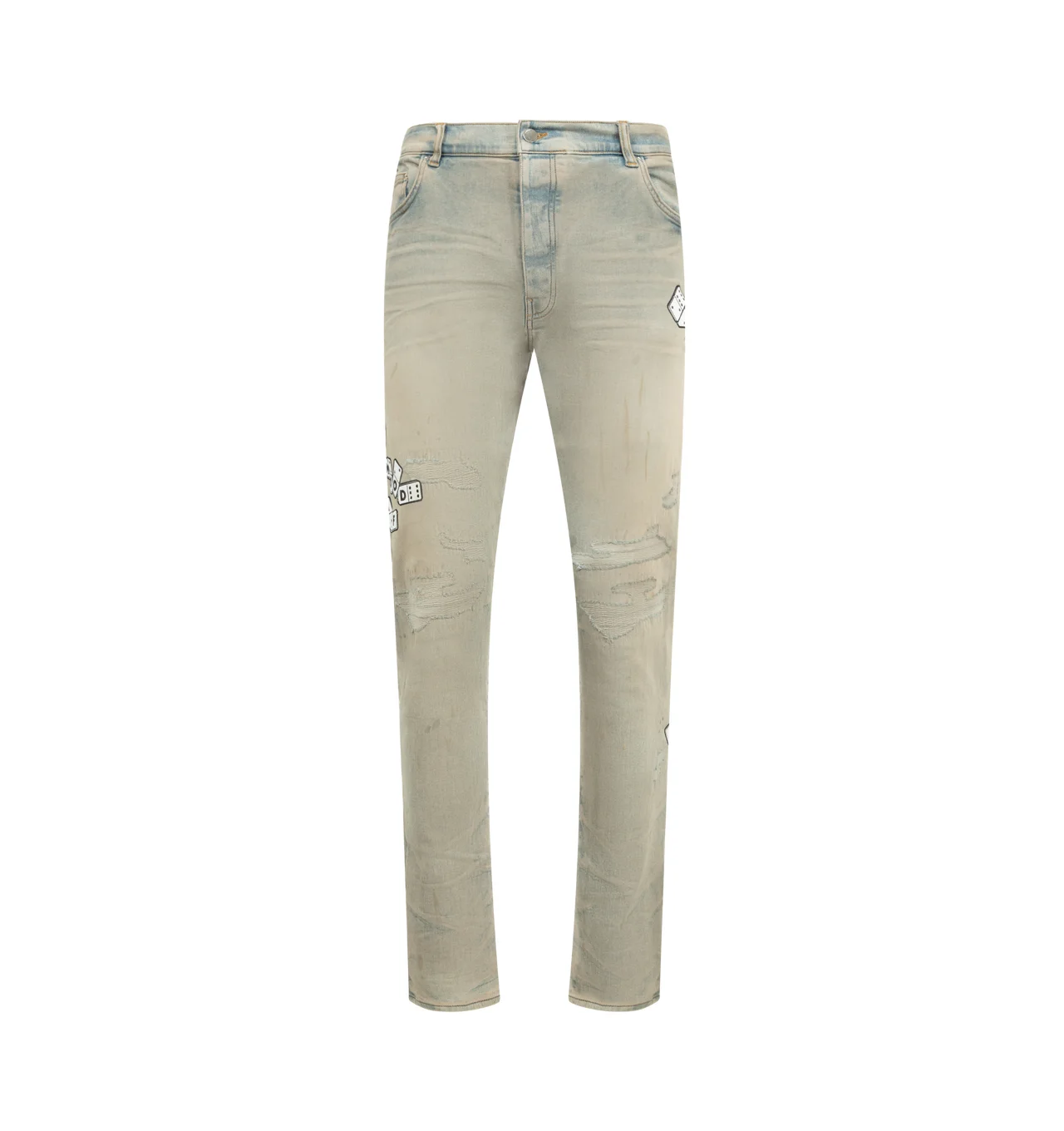AMIRI Domino Applique Skinny Jeans featuring domino motif, distressed effect, skinny fit, five pockets and button fly fastening. 92% cotton, 6% elastomultiester, 2% elastane. Made In United States. DESIGNER STYLE ID: AMBMJE1048 COLOR: 543 PERFECT ANTIQUE INDIGO