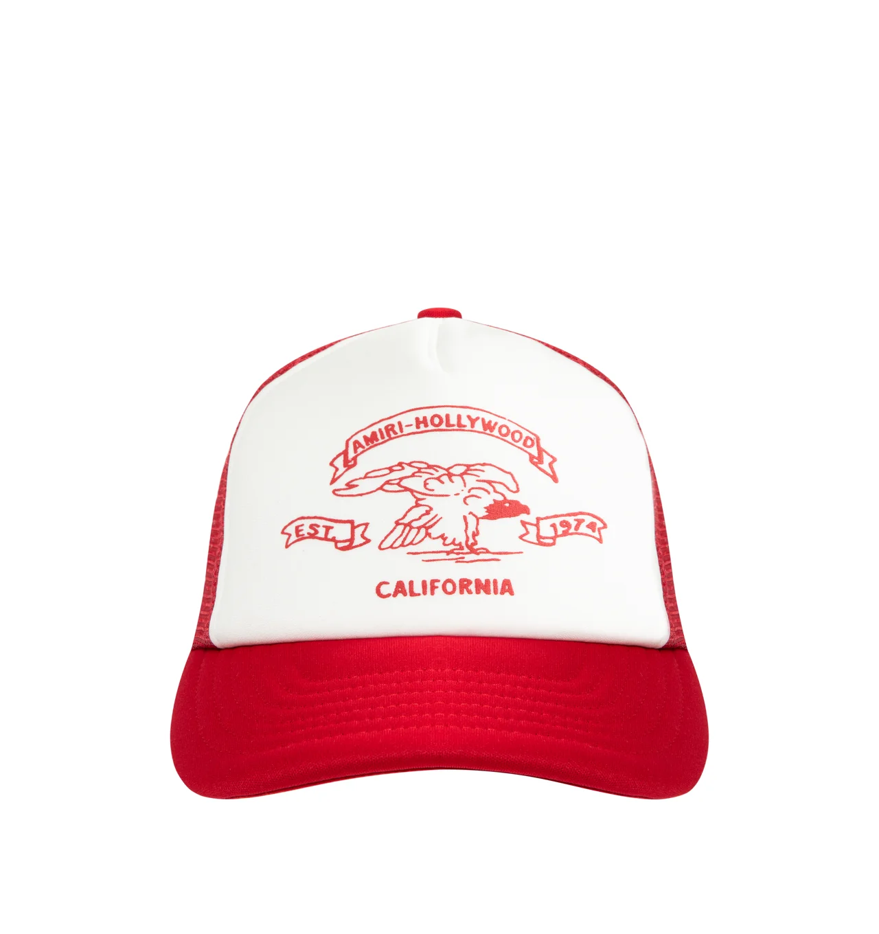 AMIRI Eagle Trucker Hat featuring adjustable back straps, front graphic and mesh back panel. 100% polyester. DESIGNER STYLE ID: AMSAHE1014 COLOR: 633 RED ROSE