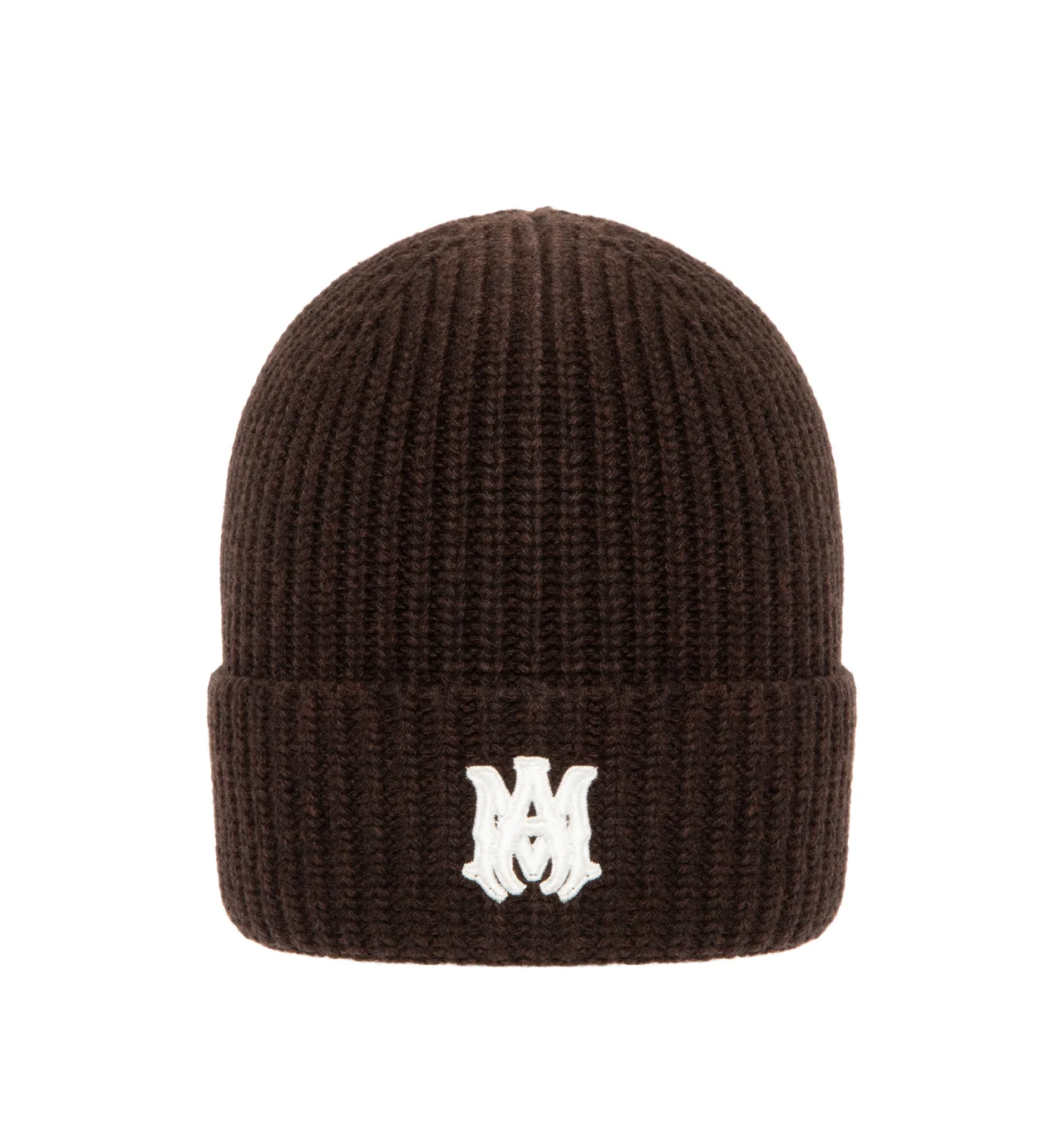 AMIRI MA Embroidered Wool Rib Beanie Hat featuring iconic MA monogram embroidered in a contrasting colorway and foldover brim. Virgin wool. Made in Italy. DESIGNER STYLE ID: AMSAHE1002 COLOR: 200 DARK BROWN