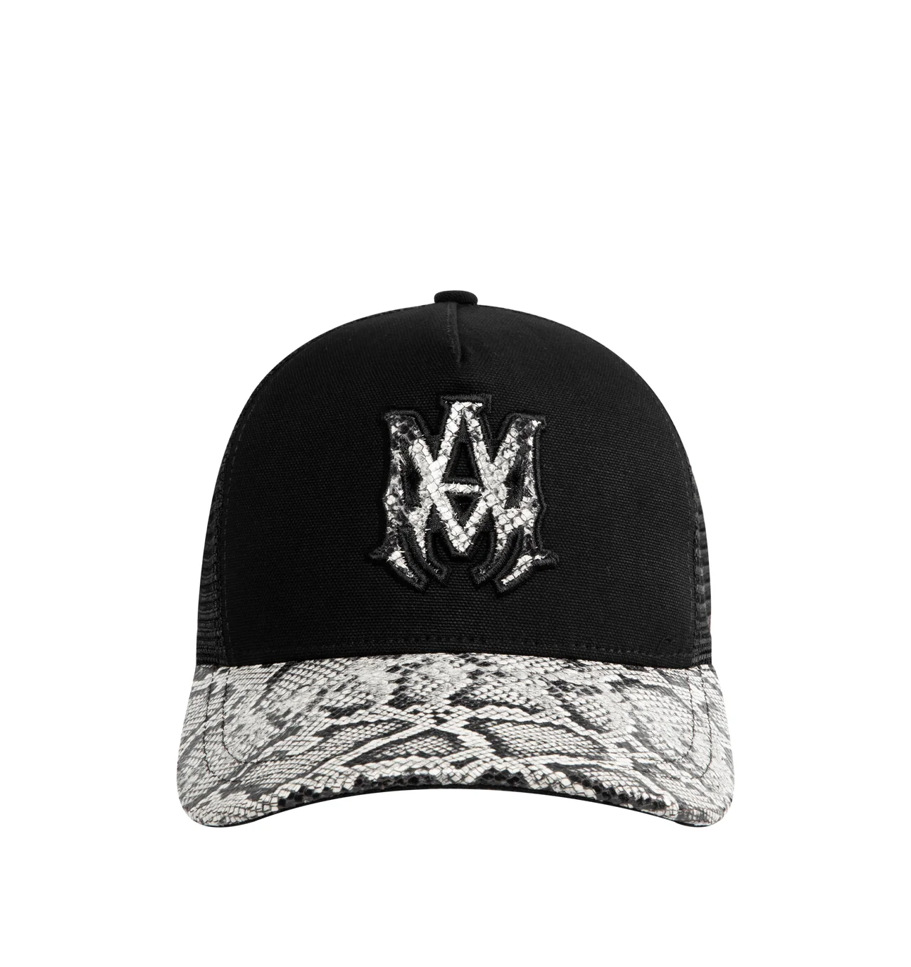 AMIRI MA Snake Trucker Hat featuring snake debossed leather with a brim, embroidered eyelets and double snapback fastening. 100% cotton. Made in United States. DESIGNER STYLE ID: AMSAHE1040 COLOR: 001 BLACK