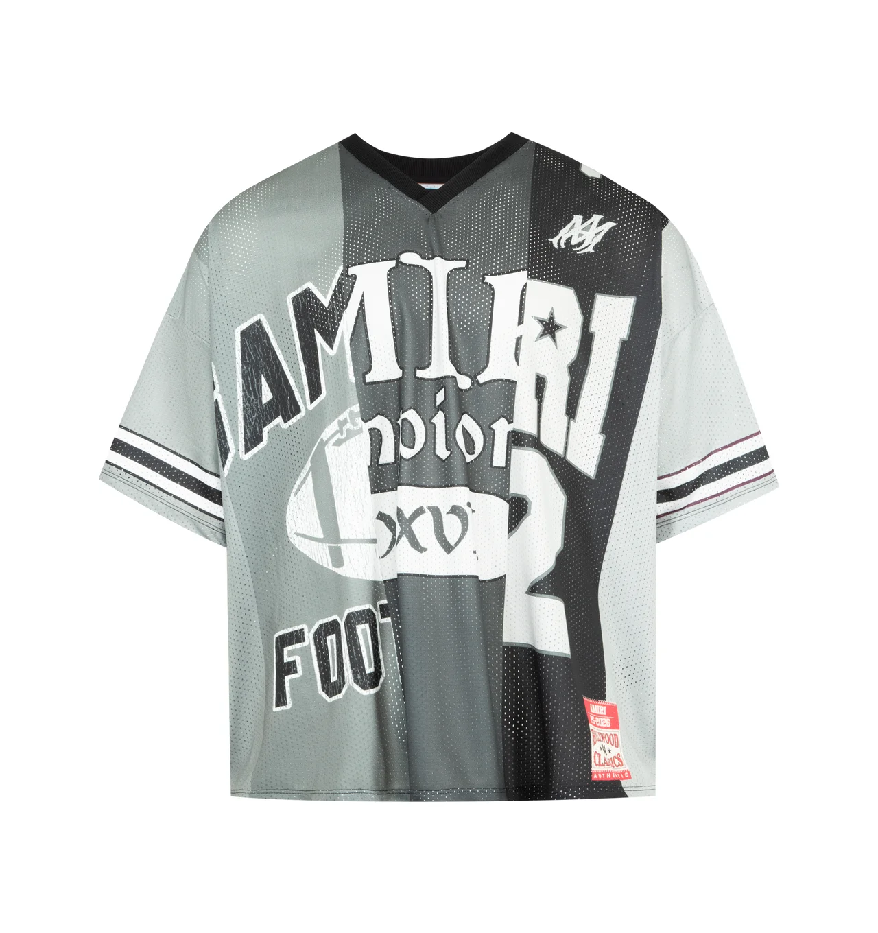 AMIRI Spliced Oversized Mesh T-shirt featuring paneled construction, stripes throughout, rib-knit V-neck, logo graphics printed at front, dropped shoulders, text printed at sleeves and back and stripes at sleeves. 100% polyester. Trim: 96% polyester, 4% elastane. Made in Italy. DESIGNER STYLE ID: AMT0JR1011 COLOR: 001 BLACK