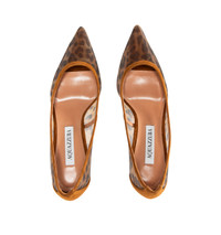 AQUAZZURA Nude Pump featuring leopard mesh see-through panels, supple suede trim, pointed toes, stiletto heels, padded leather insole and signature logo detailing. 85mm. Mesh, suede. Made in Italy. DESIGNER STYLE ID: NDEMIDP0-LHD-NGN COLOR: NATURAL/COGNAC