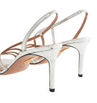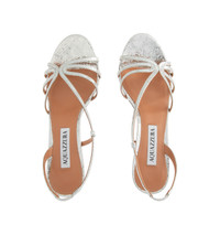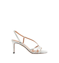 AQUAZZURA Talk To Me Sandal 75 featuring slingback strap, stiletto heel, leather insole and signature logo detailing. Leather. 75 mm. Made in Italy. DESIGNER STYLE ID: TTMMIDS1-MSK COLOR: CCC SILVER