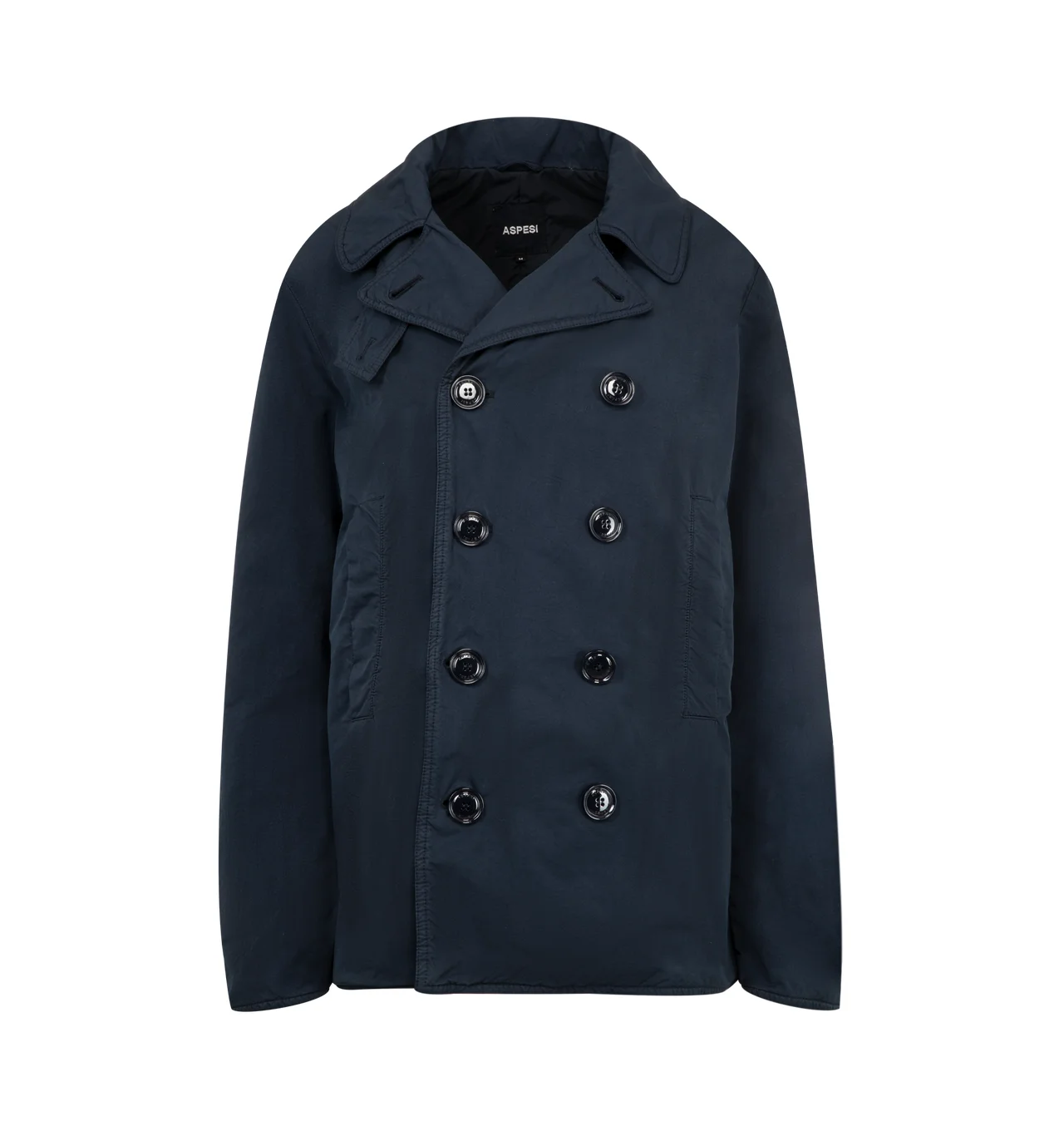 ASPESI Giacca Hopper Jacket featuring short peacoat, garment-dyed finish, functional padding, bouble-button front closure, one-sided interior pocket with patch and button and chin flap. 70% polyester, 30% nylon. DESIGNER STYLE ID: W5-I-3I04-1024 COLOR: 85098 NAVY/NAVY