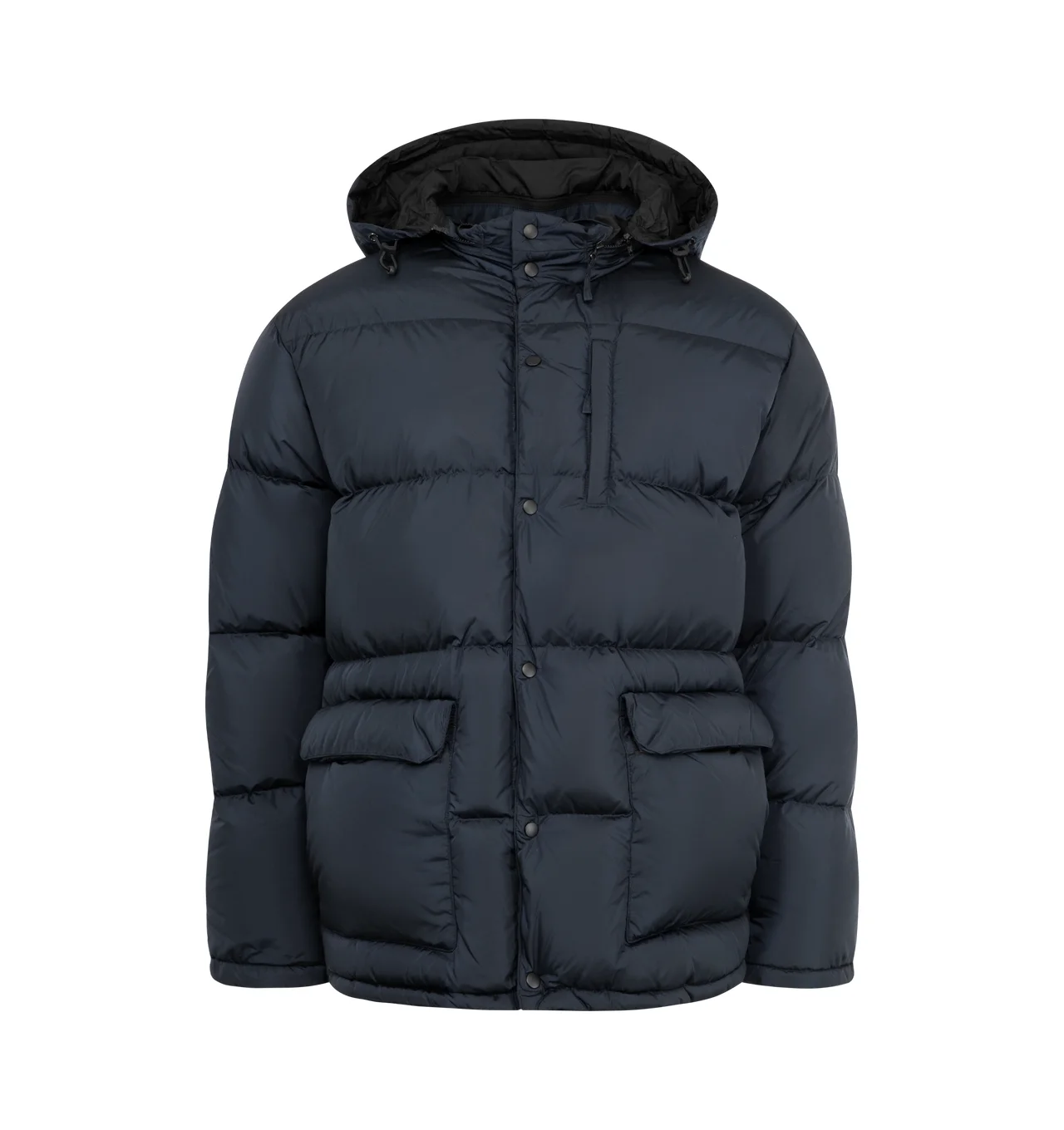 ASPESI Moschino II Jacket featuring down-filled quilted nylon taffeta jacket, stowaway hood at stand collar, zip closure with press-stud placket, flap pockets, textile logo flag at hem, inset rib knit cuffs, elasticized snowskirt at interior, full satin lining and logo-engraved gunmetal-tone hardware. 80% down, 20% feathers. DESIGNER STYLE ID: CN-I-4IV3-V006 COLOR: 85101 NAVY/NAVY