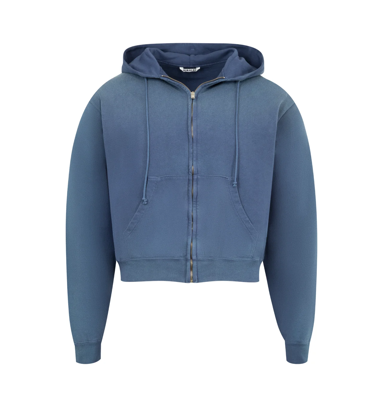 AURALEE Product Dyed Pima Light Sweat Zip Parka Hoodie featuring front zip fastening, drawstring hood, front pouch pocket, long sleeves and ribbed hem. 100% cotton. Made in Japan. DESIGNER STYLE ID: A25AP01MS COLOR: LIGHT NAVY