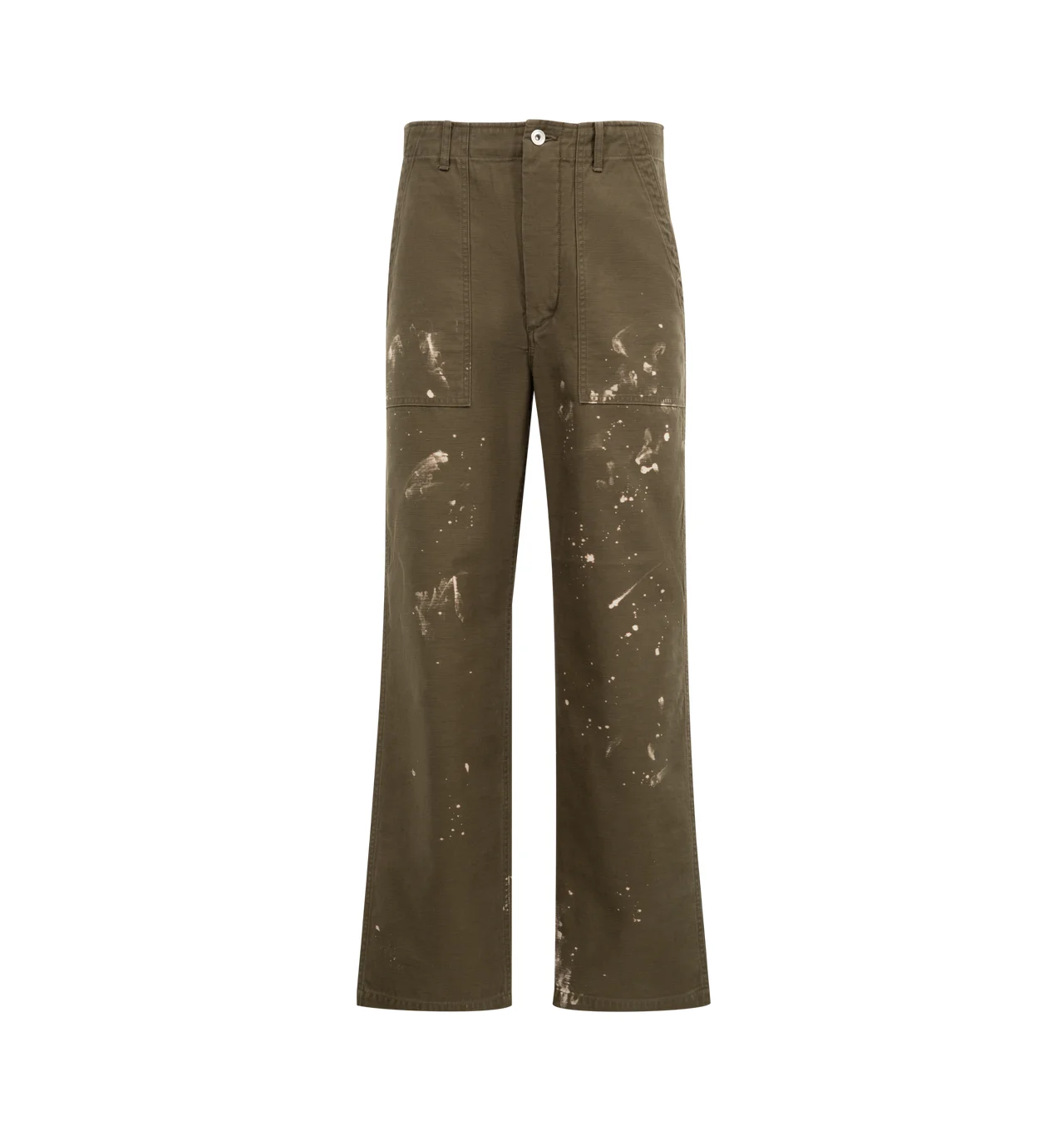 AURALEE Washed Baggy Satin Bleached Baker Pants featuring four pocket style, relaxed fit, button zip closure, belt loops and paint throughout. 100% cotton. DESIGNER STYLE ID: A25AP01BP COLOR: KHAKI BROWN