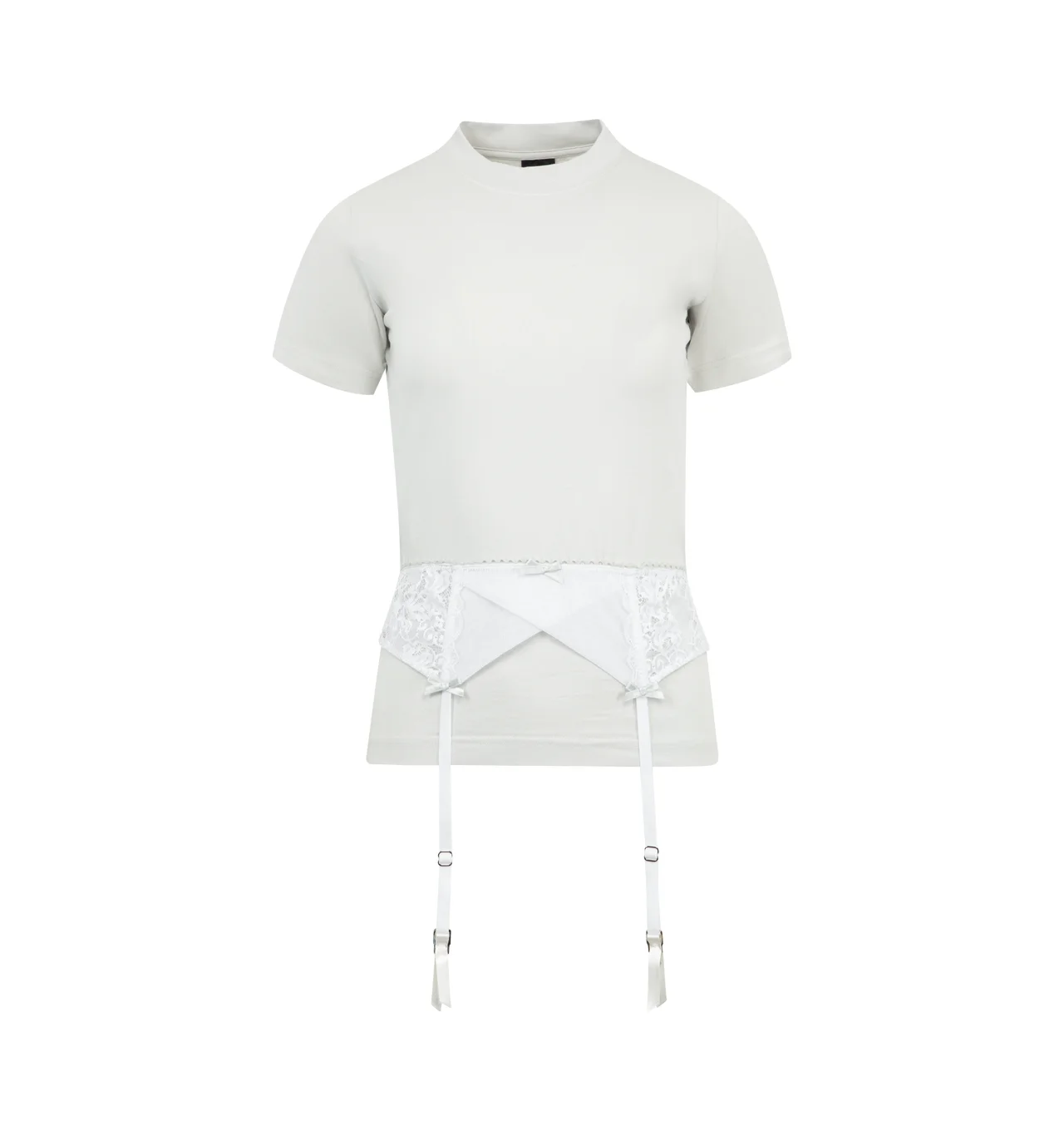 BALENCIAGA Lingerie T-Shirt featuring peeling stretch jersey, crewneck, short sleeves and lingerie detail at waist. 95% cotton, 5% elastane. Made in Portugal. DESIGNER STYLE ID: 828869-TNVB2 COLOR: 9012 DIRTY WHITE