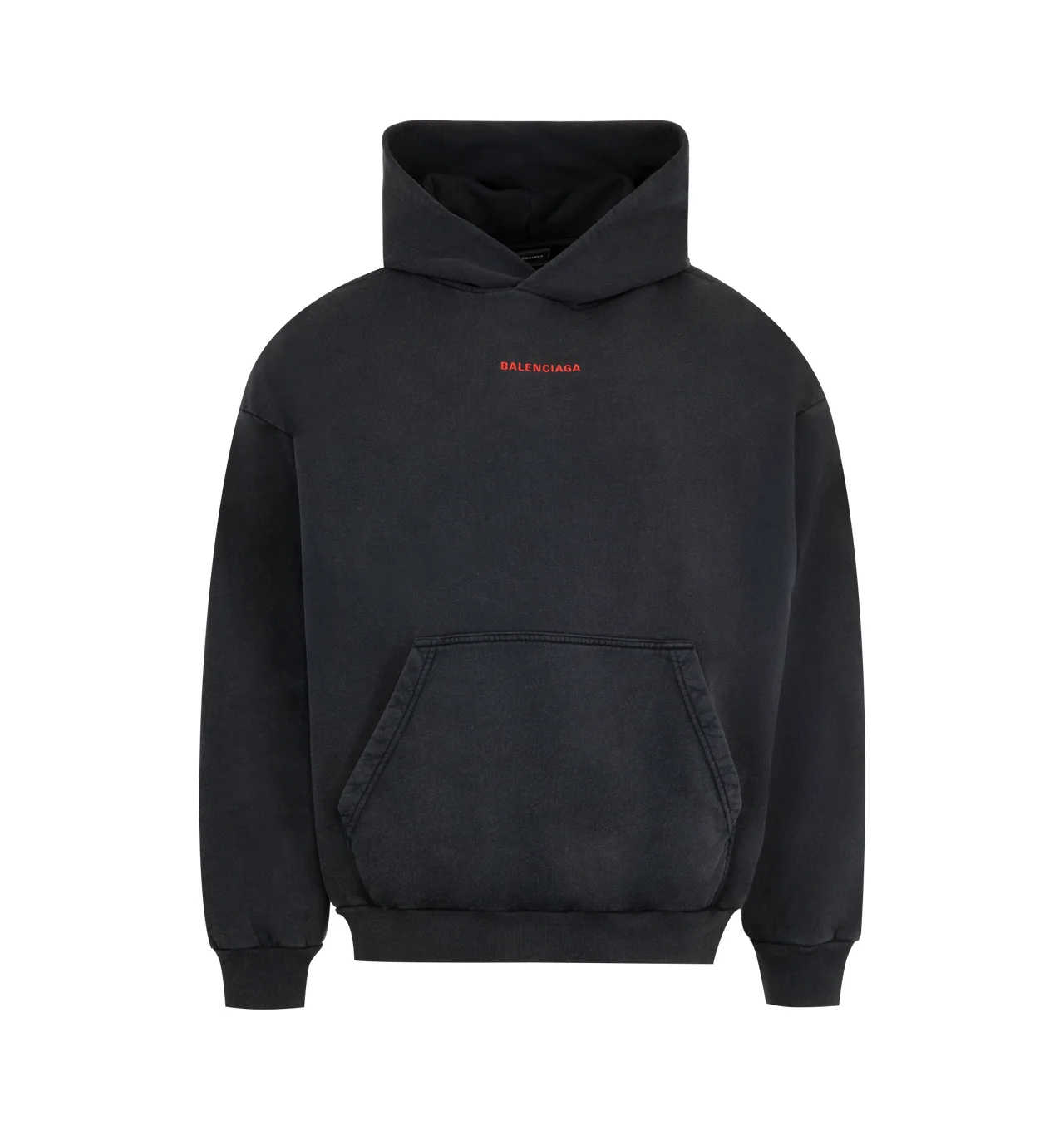 BALENCIAGA Balenciaga Back Hoodie Medium Fit featuring dry fleece, hood without drawstring, dropped shoulders, 1 kangaroo pocket on front, gathered at cuffs and waistline and Balenciaga back artwork embroidered at front and back. 100% cotton. Made in Portugal. DESIGNER STYLE ID: 767877-TTVJ2 COLOR: 8483 FADED WASHED BLK/RED