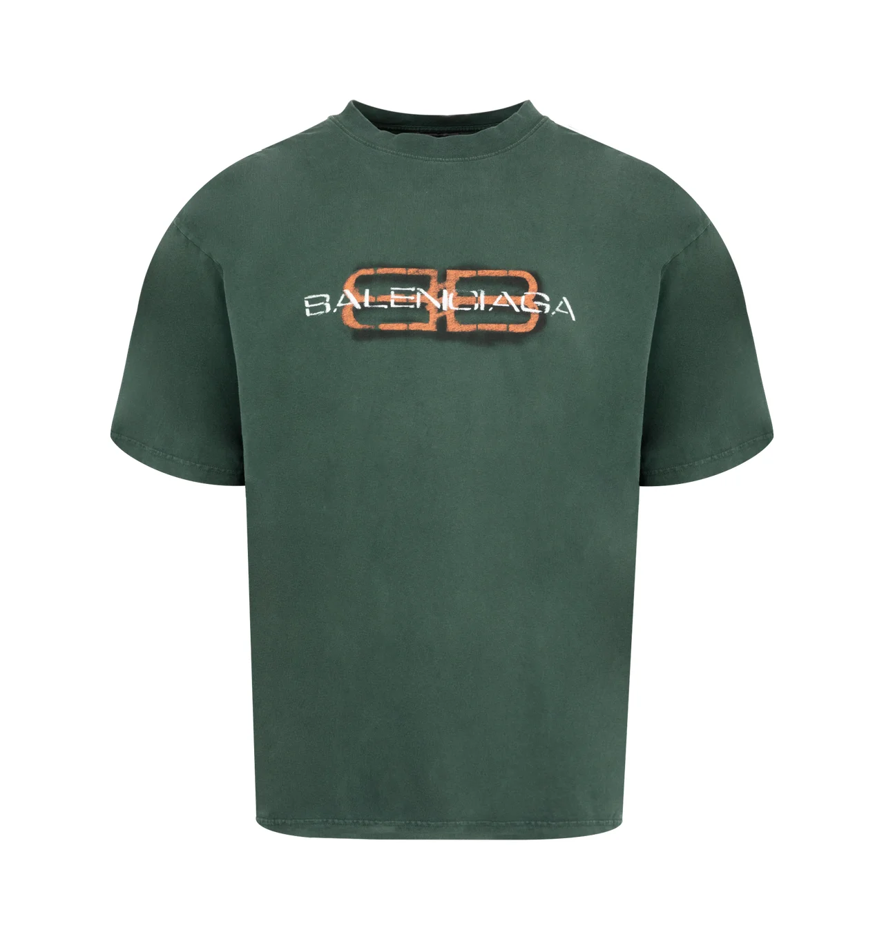 BALENCIAGA BB Icon Stencil T-Shirt Medium Fit featuring dry jersey, crewneck, short sleeves and BB icon stencil artwork printed at front. 100% cotton. Made in Portugal. DESIGNER STYLE ID: 764235-TTVD6 COLOR: 3004 DARK GREEN