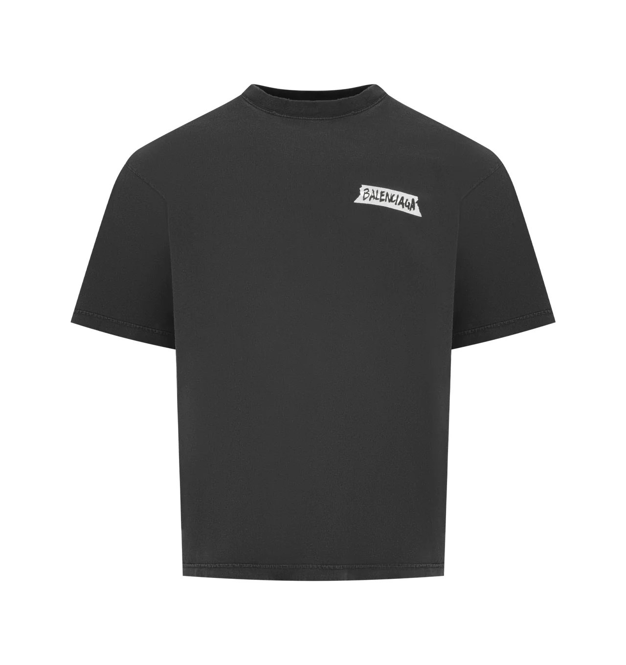 BALENCIAGA Masking Tape T-Shirt Medium Fit in faded black dry jersey featuring crewneck, short sleeves and masking tape artwork at front and back. 100% cotton. Made in Portugal. DESIGNER STYLE ID: 764235-TTVL6 COLOR: 1041 FADED WASHED BLACK