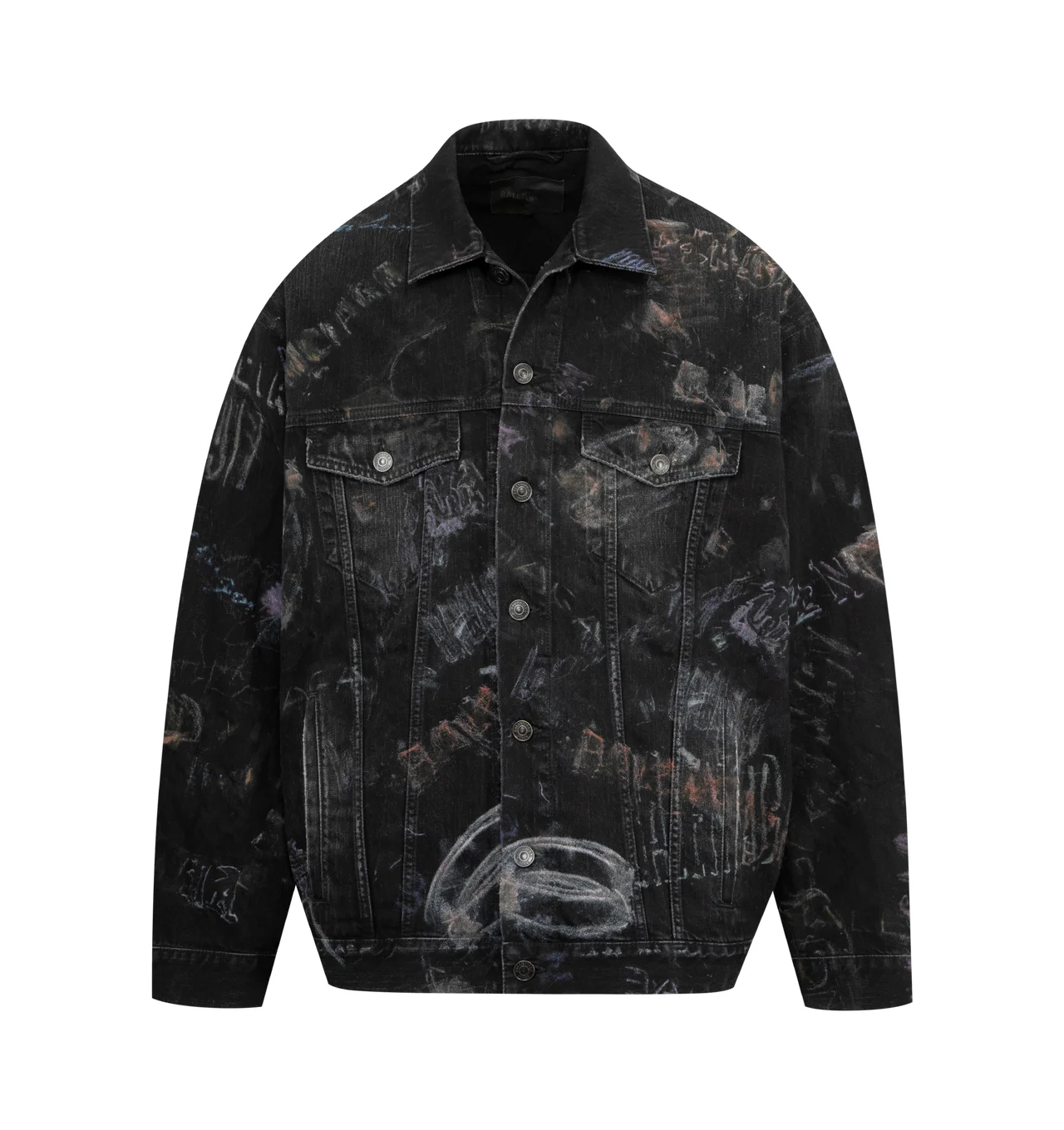 BALENCIAGA Oversized Jacket in washed crayon allover cotton denim featuring 7 button front, 2 buttoned pockets at chest, 2 slash pockets, buttoned cuffs, adjustable buttoning at waist and Balenciaga engraved flex buttons. 100% cotton. Made in Italy. DESIGNER STYLE ID: 857181-TTWA8 COLOR: 1037 BLACK FADE OUT