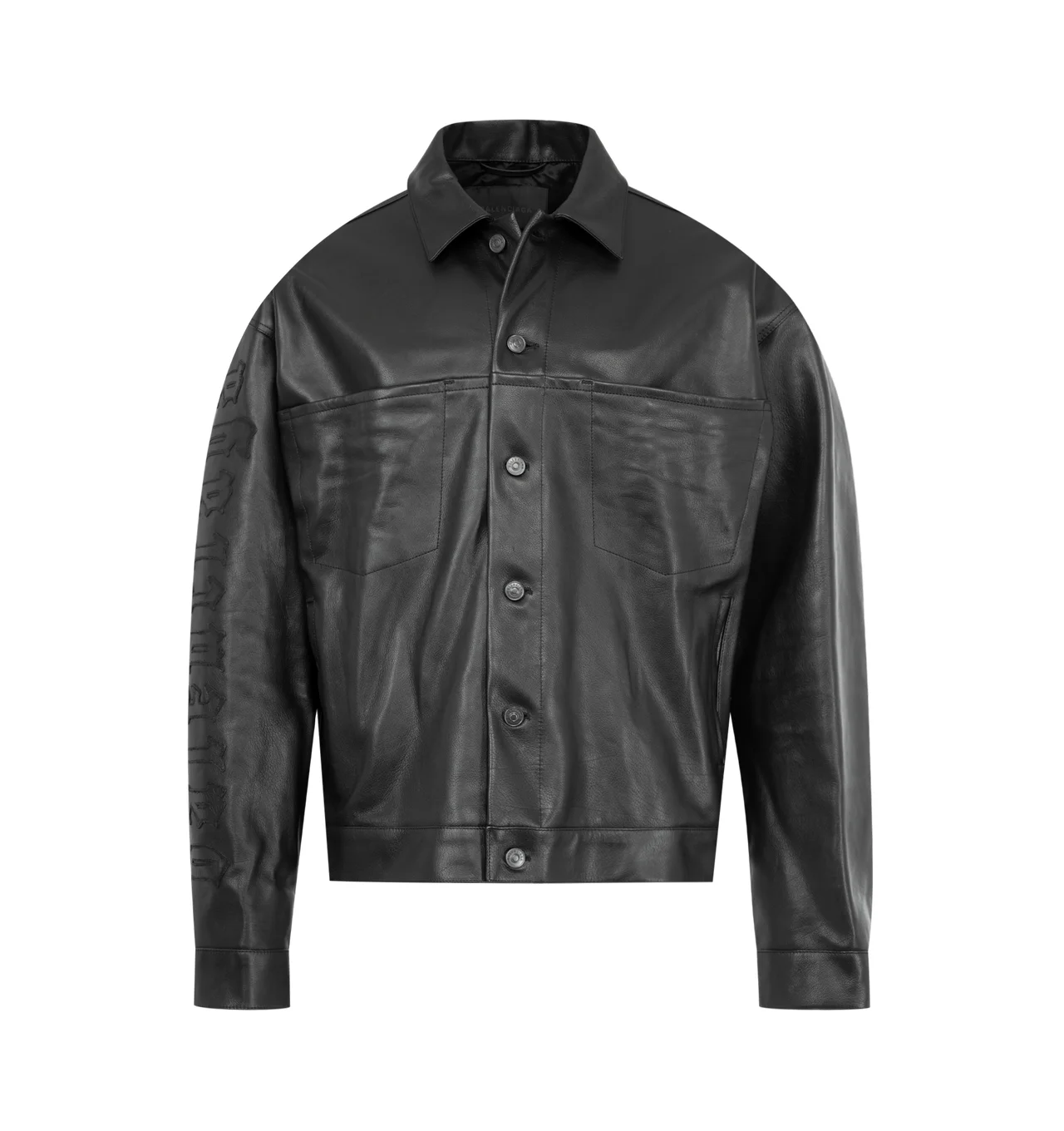 BALENCIAGA Shirt Jacket featuring grainy soft buffalo skin, shirt collar, 6 button front, 2 pockets at chest, 2 slash pockets, buttoned at cuffs, adjustable buttoning at waist and gothic denim artwork embroidered on right sleeve. 100% buffalo. Lining; 100% cupro. Made in Italy. DESIGNER STYLE ID: 856343-TMS03 COLOR: 1000 BLACK