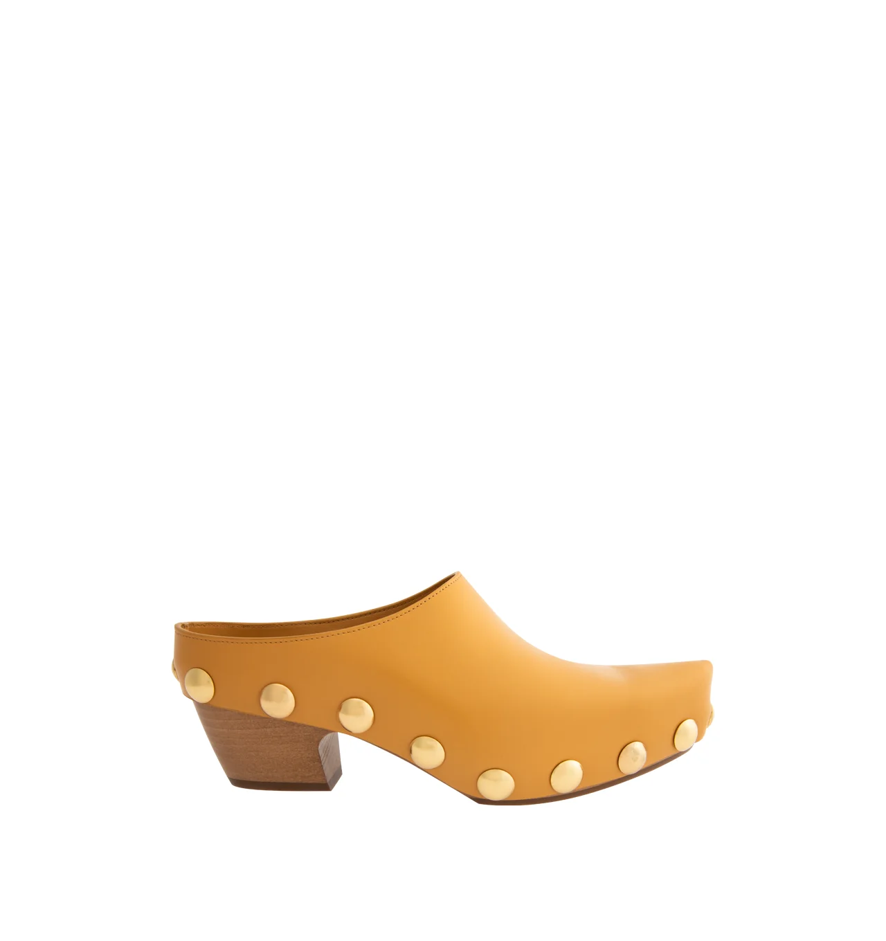 BOTTEGA VENETA Gondola Clog featuring shiny calf leather with metal stud detailing and beech wood platform. Lining: Calfskin. Lugged rubber outsole. Made in Italy. DESIGNER STYLE ID: 866998-V6HR0 COLOR: 2671 MOJAVE BEIGE