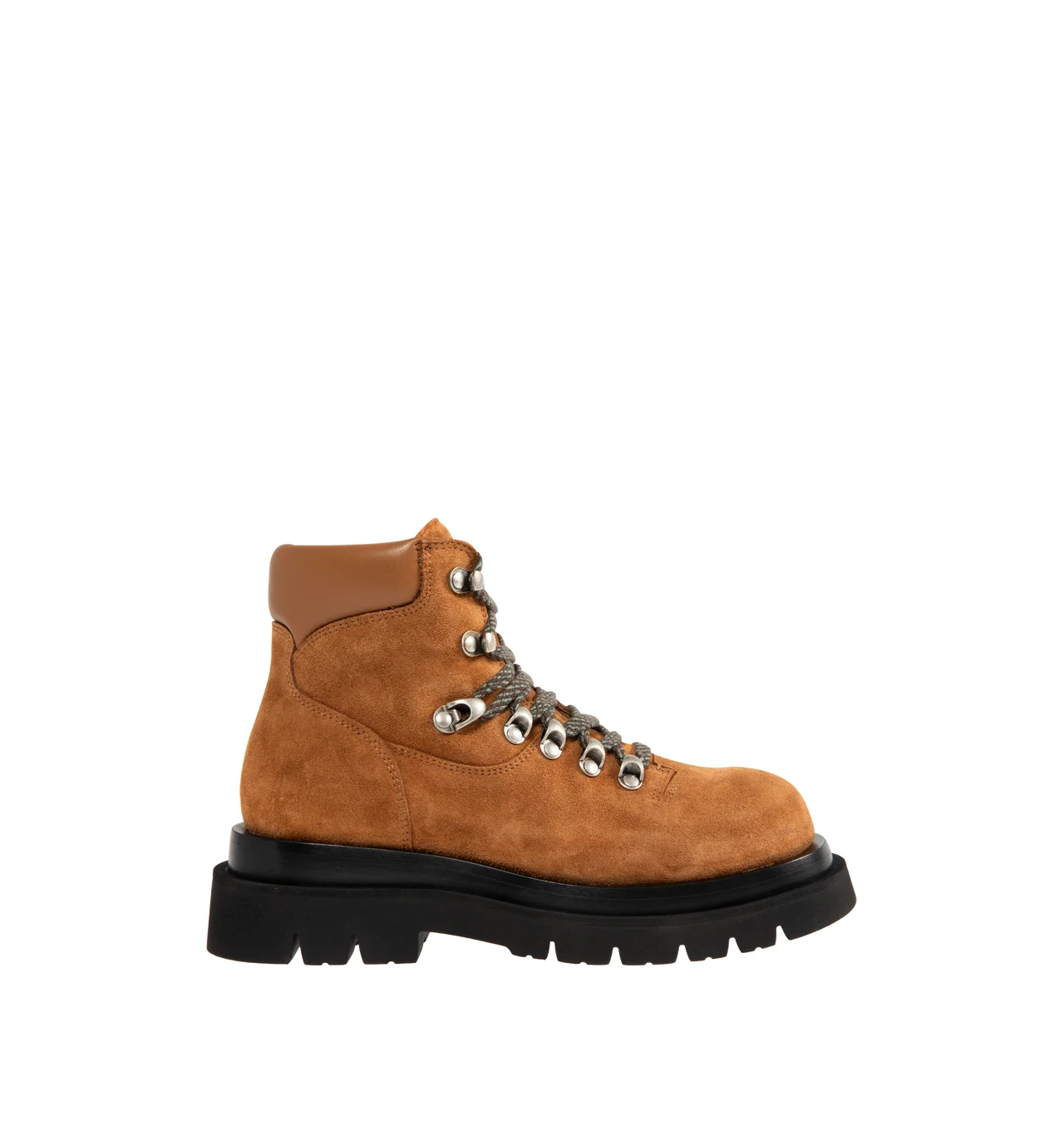 BOTTEGA VENETA Lug Hiking Ankle Boot featuring lace-up hiking ankle boot crafted from rugged suede with a smooth leather collar and micro rubber outsole. Lining: calf leather. Made in Italy. DESIGNER STYLE ID: 843955-V4QN2 COLOR: 7665 CARAMEL