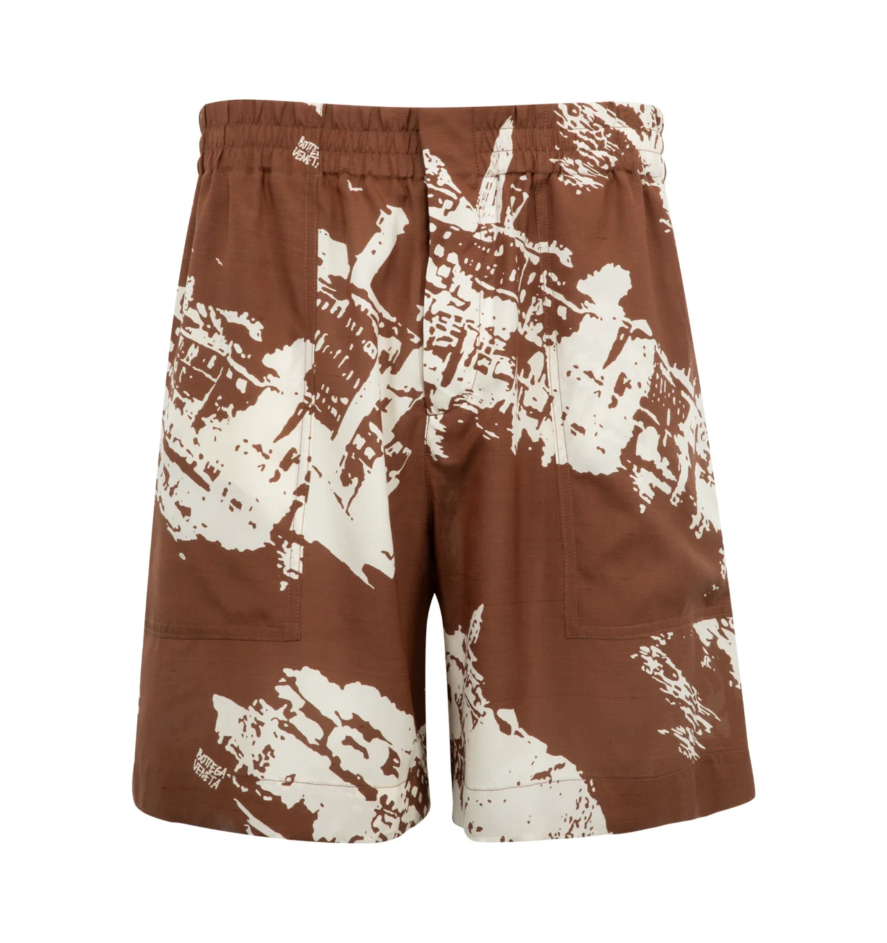 BOTTEGA VENETA Italian Postcard Silk Shorts featuring shorts in lightweight silk shantung with Italian postcard print, zipper and hook closure and lined. 75% silk, 25% cotton. Made in Italy. DESIGNER STYLE ID: 841528-V5T80 COLOR: 2154 PECAN/DOVE