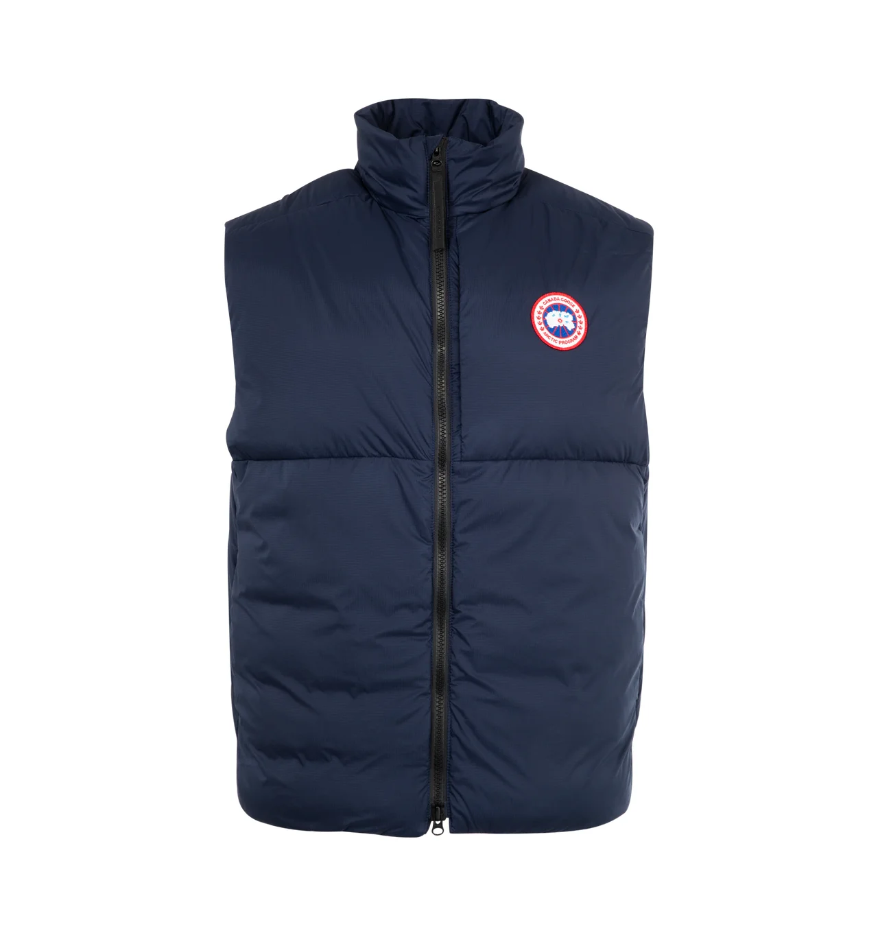 CANADA GOOSE Lodge Vest featuring rip-stop construction, hip length, down-filled collar with a draw cord to seal out drafts, YKK® two-way locking reversed coil zipper front closure, with logo pull, insulated wind guard under front zipper, brushed tricot at the chin and behind the neck, single-handed adjustable hem using pocket access to seal out cold and wind, zip hand pockets, and an inside stretch mesh pocket. Made in Canada. DESIGNER STYLE ID: 4160M COLOR: 9063 ATLANTIC NAVY