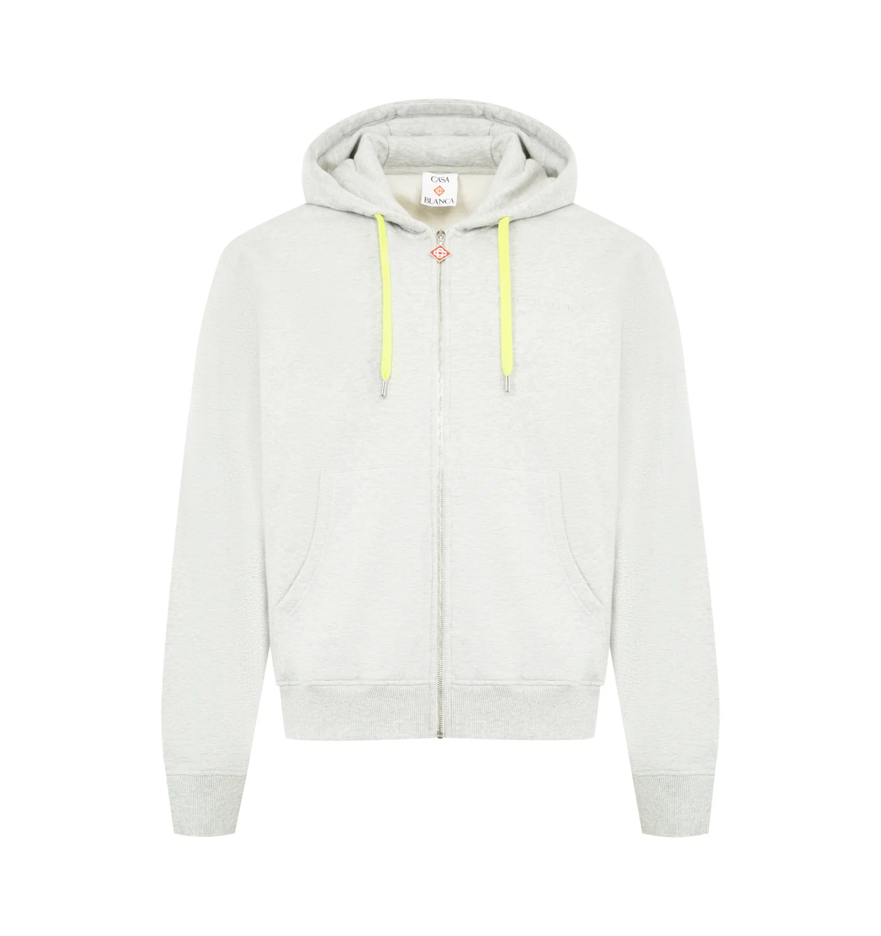 CASABLANCA Cashmere Blend Zip-Up Hooded Sweatshirt featuring hood, drawstring fastening, a zip closure with diamond logo on the zipper tab, patch pockets, and ribbed cuffs and hem detail. 95% cotton, 5% cashmere. Made in Portugal. DESIGNER STYLE ID: M-SP26-JTP-458-01 COLOR: GREY MARBLE