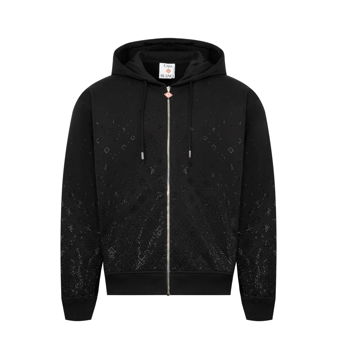 CASABLANCA Crystal Monogram Zip-Up Hooded Sweatshirt featuring hood, drawstring fastening, a zip closure with logo on the zipper tab, patch pockets, and ribbed cuffs and hem detail. Made in Portugal. DESIGNER STYLE ID: M-SP26-JTP-512-01 COLOR: CRYSTAL MONOGRAM
