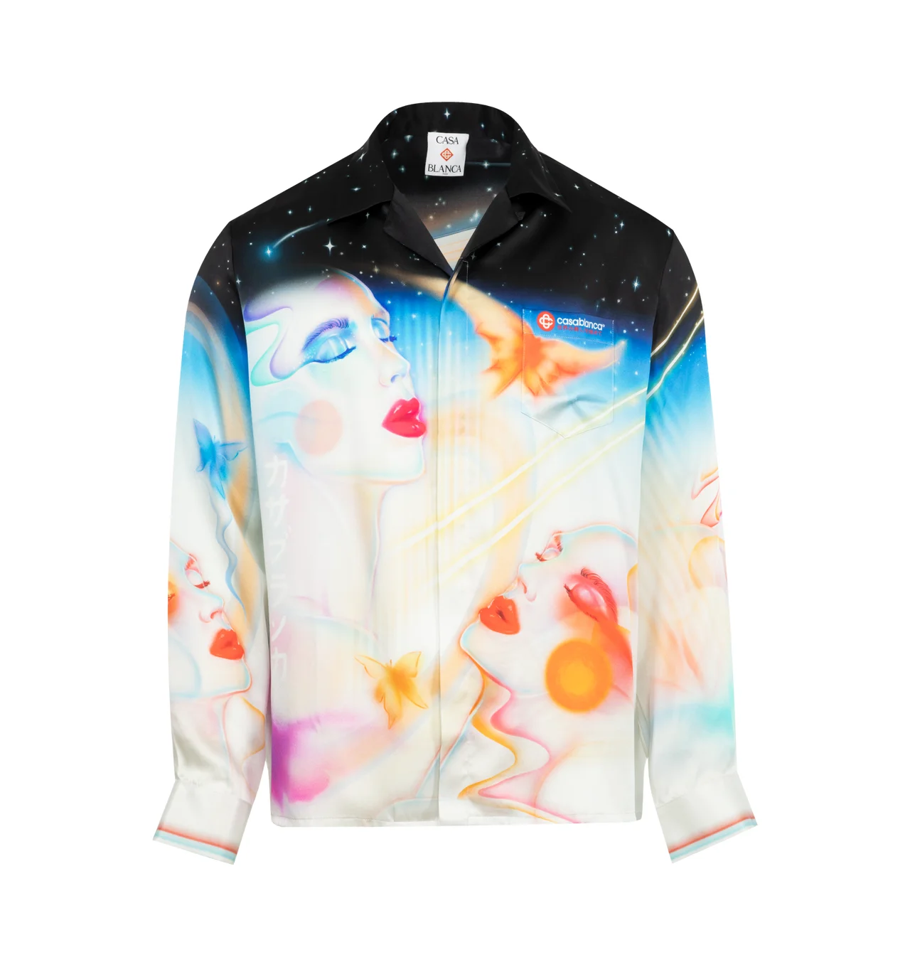 CASABLANCA Long-Sleeve Silk Shirt featuring printed silk twill fabric, cuban collar, long sleeves and concealed button closure. 100% silk. Made in Italy. DESIGNER STYLE ID: U-MPF25-SH-006-02 COLOR: GALACTIC CONNECTION