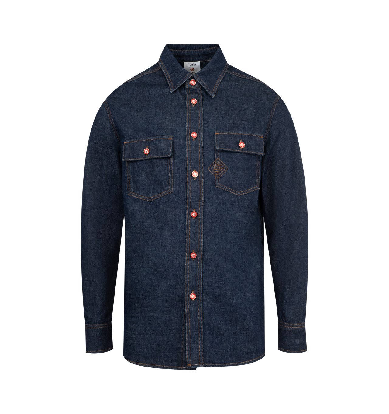 CASABLANCA Monogram Long Sleeve Denim Shirt featuring breast pockets, a point collar, button closure, branded gold-plated hardware, a box pleat in the back and an embroidered CC logo. 100% cotton. Made in Portugal. DESIGNER STYLE ID: MPF25-SH-189-01 COLOR: INDIGO
