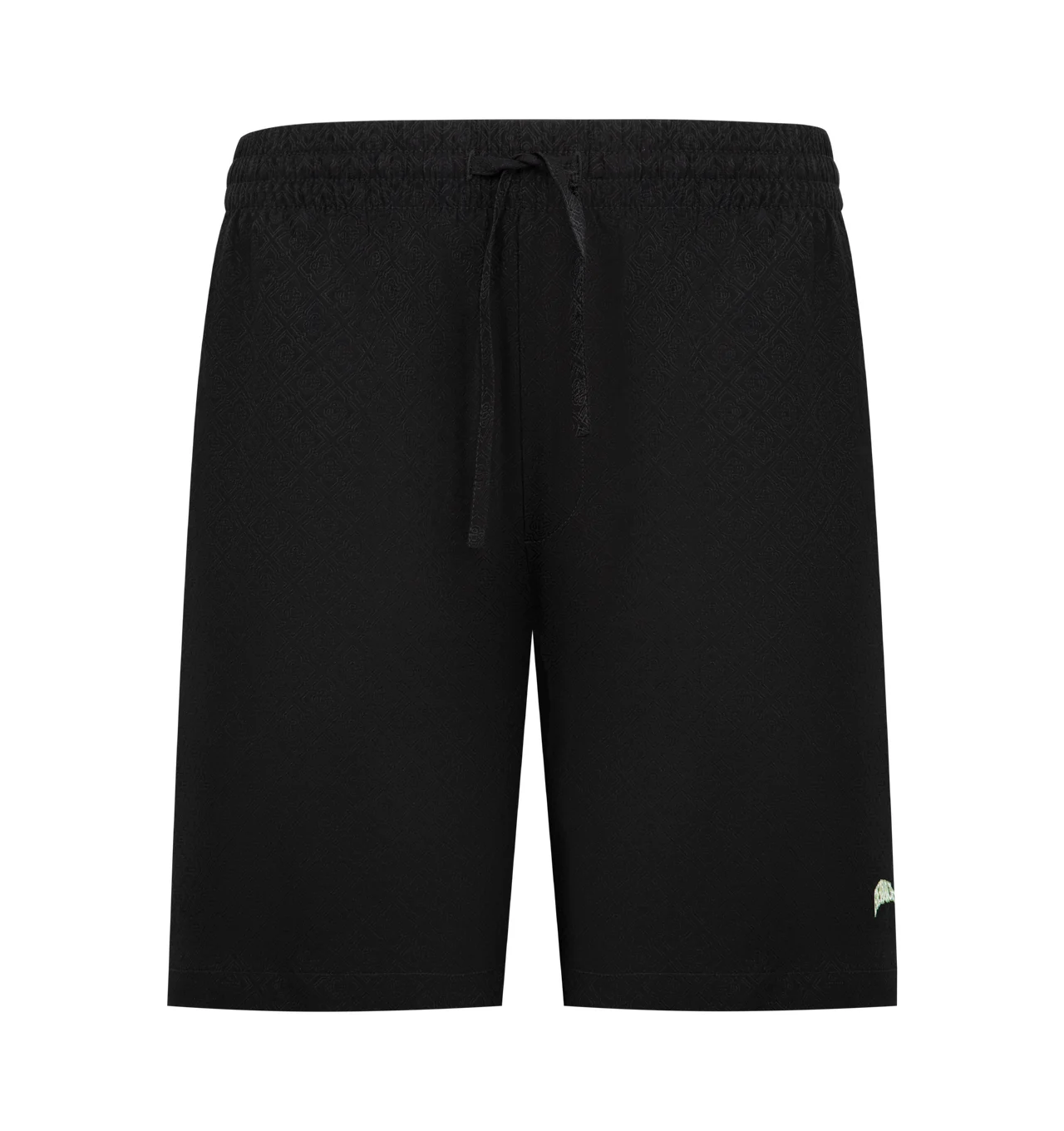 CASABLANCA Volcano Silk Shorts featuring the season's artwork of a volcano looming dramatically behind half-silhouetted palm trees, elasticised waistband, drawstring fastening, in-seam side pockets, a back patch pocket and a relaxed silhouette. 100% silk. Made in Italy. DESIGNER STYLE ID: M-SP26-TR-399-08-EX-BC COLOR: VOLCANO