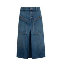 CHLOE Denim Skirt featuring knee length, Chloe-engraved button fastenings at front, oversized front patch pockets with zippers, belt loops and front box pleat. 100% cotton. DESIGNER STYLE ID: CH25ADJ01251 COLOR: 427 HAZY BLUE