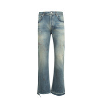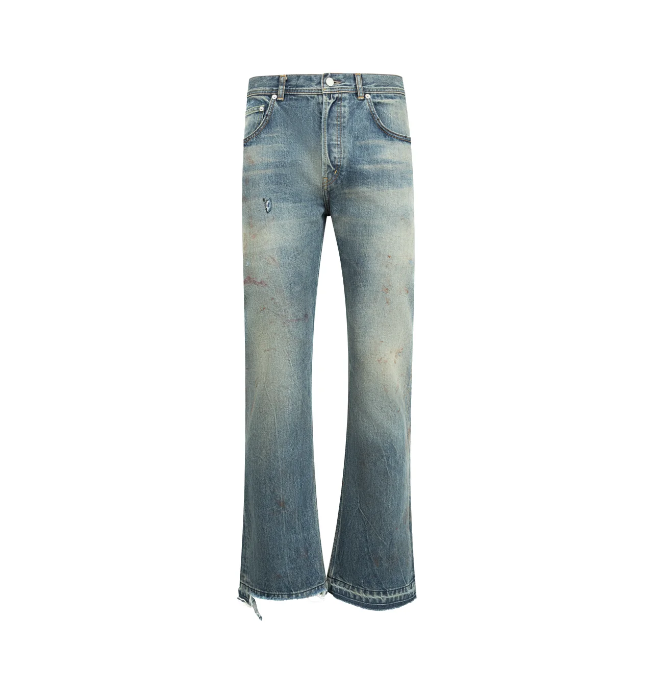 ENFANTS RICHES DEPRIMES Elvis Texas Flare Jeans featuring 14oz Japanese cotton denim, mid-rise, slightly flared silhouette, five-pocket styling, a button fly, belt loops at the waistband, ERD-branded hardware, an embossed logo patch at the back waistband, raw hem leg openings and a heavy vintage wash and distressing throughout. DESIGNER STYLE ID: 050-426 COLOR: ANTIQUE BLUE