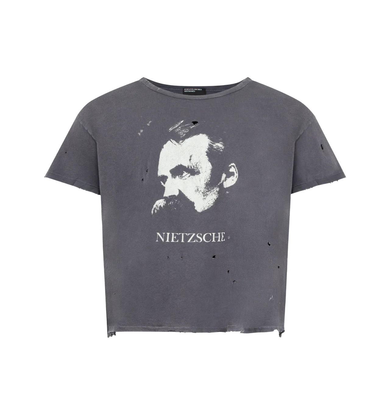 ENFANTS RICHES DEPRIMES Nietzsche T-shirt featuring lightweight vintage-texture cotton jersey, boxy silhouette, rib-knit neckline, single-stitch hems and graphic on front. Made in the USA. DESIGNER STYLE ID: 010-870 COLOR: BURNOUT GRAY